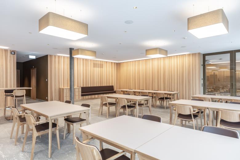 Die zusammenhängenden Gemeinschaftsbereiche im Erdgeschoss schaffen mit ihrer Öffentlichkeit einen Treffpunkt im Zentrum des Pflegeheims. Das offene Entree heisst die Besucher, Gäste und Bewohnerinnen und Bewohner willkommen.