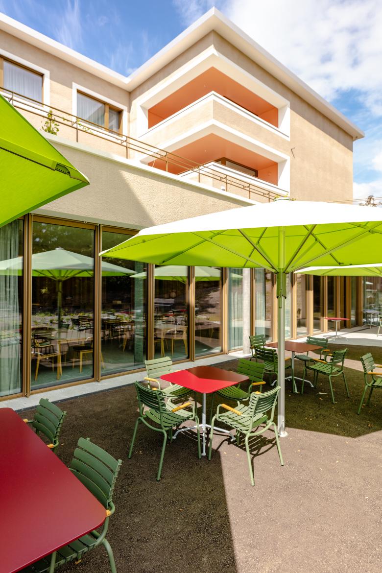 Im Bestandsgebäude werden gezielte und wohldosierte Eingriffe zur Sanierung und Nutzungsanpassungen vorgenommen um die Aufenthaltsqualität und Attraktivität zu erhöhen. Die Bausubstanz aus dem Jahr 1995 wird weitestgehend geschont und die Anpassungen sind örtlich begrenzt. Die Zimmer im Bestandsbau erhalten ein behinderten- und rollstuhlgerechtes Bad mit Lavabo, WC und Dusche. Das bestehende zweite Lavabo kann in den Zimmern wenn es gewünscht wird erhalten bleiben. Die wesentlichen Veränderungen im Bestandsbau betreffen die Nebenraumschicht, in der nun die neuen Stations- und Rapportzimmer angeordnet werden. Für die Wohngruppen im Bestandsgebäude werden im südlichen Bereich attraktive Wohn- und Aufenthaltsräume geschaffen, die sich zusätzlich mit den Loggien zur neu geschaffenen Gartenlandschaft öffnen und verschiedene Ausblicke und Orientierungen erlauben.
