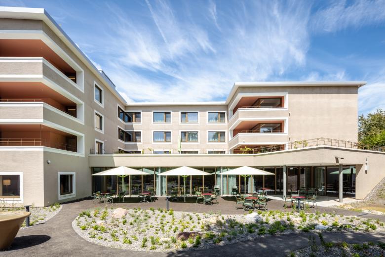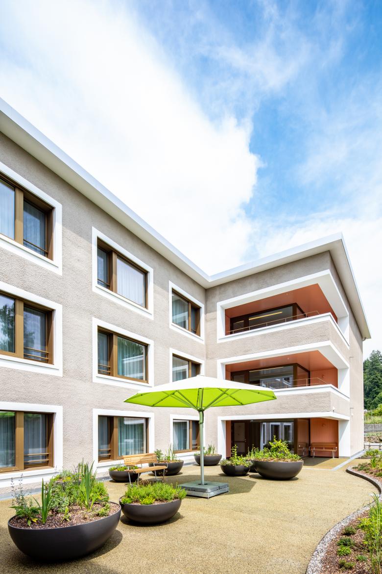 Die Situation ist geprägt von den giebelständigen, grösseren und kleineren Wohnhäusern in der Nachbarschaft und durch die grossen Bauvolumen des Pflegezentrums Luegeten. Diese beiden Baukörper bilden gegeneinander verdrehte hofartige Aussenräume, die als Freiraum für die Alterswohnungen im Nordwesten und als Hausplatz im Zentrum der Gesamtanlage ausgebildet sind. Mit der Setzung des neuen Erweiterungsbaus an der Strasse wird das ortsbauliche Prinzip weitergeführt. Zusammen mit dem Bestandsbau bildet der Neubau einen nach Süden hin offenen Hof aus. Dieser grosszügige Aussenraum bietet eine Gartenlandschaft mit verschiedenen Aufenthalts- und Begegnungszonen.