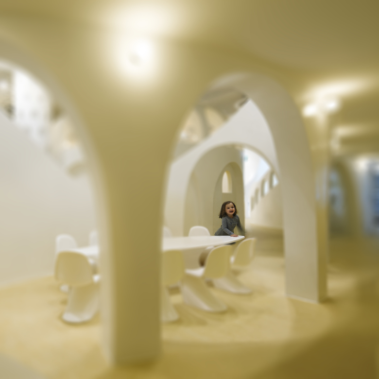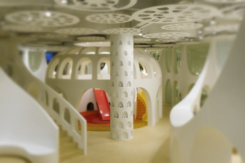 Surrounded by numerous circular arches of different sizes, the space which is sometimes small or big, and sometimes is wide or narrow, is a winding path leading to a secluded place and every part has different impression. For children, the more than ten kinds of different functions seem to be separated but actually they are integrated. At the same time enjoying them, children, just like Alice in Wonder Land when she enters into maze, fully enjoy the rich experience that is brought by space in the unusual psychedelic world.