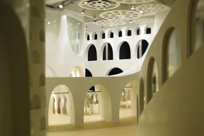Because the theme of “arch” which was previously used in Marco&Mari in Beijing successfully interpreted the properties of this children clothing brand, therefore, we further developed it into a maze. Taking advantage of ceiling height of 4.6meter, we make a huge dome which is surrounded by alternate bending wall surfaces in order to divide different functional areas. The wall surfaces which continuously transform and use four kinds of different curvatures play a bearing role of supporting the two floors, and at the same time, meet more than ten kinds of functions’ different requirements for dimension, form, openness and closure performance and create different sense of space. And at the same time, every curved surface segments many space factors, such as clothing show, stair, reception and so on by taking advantage of height change in vertical direction.