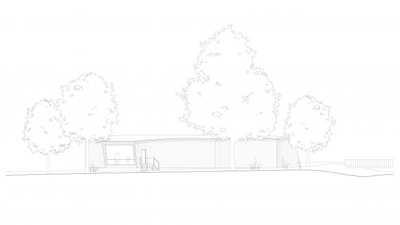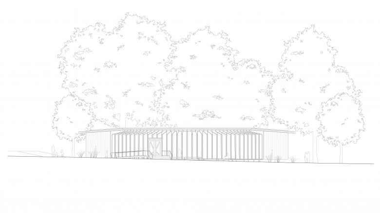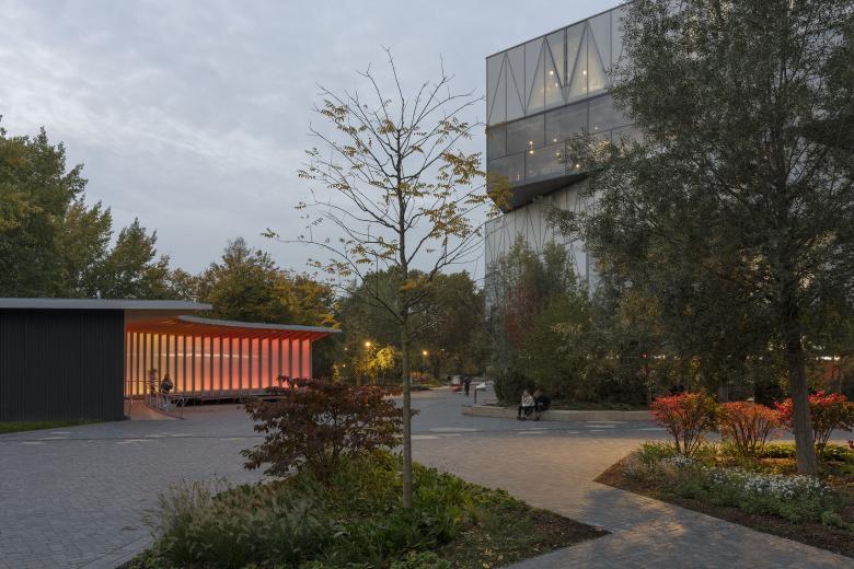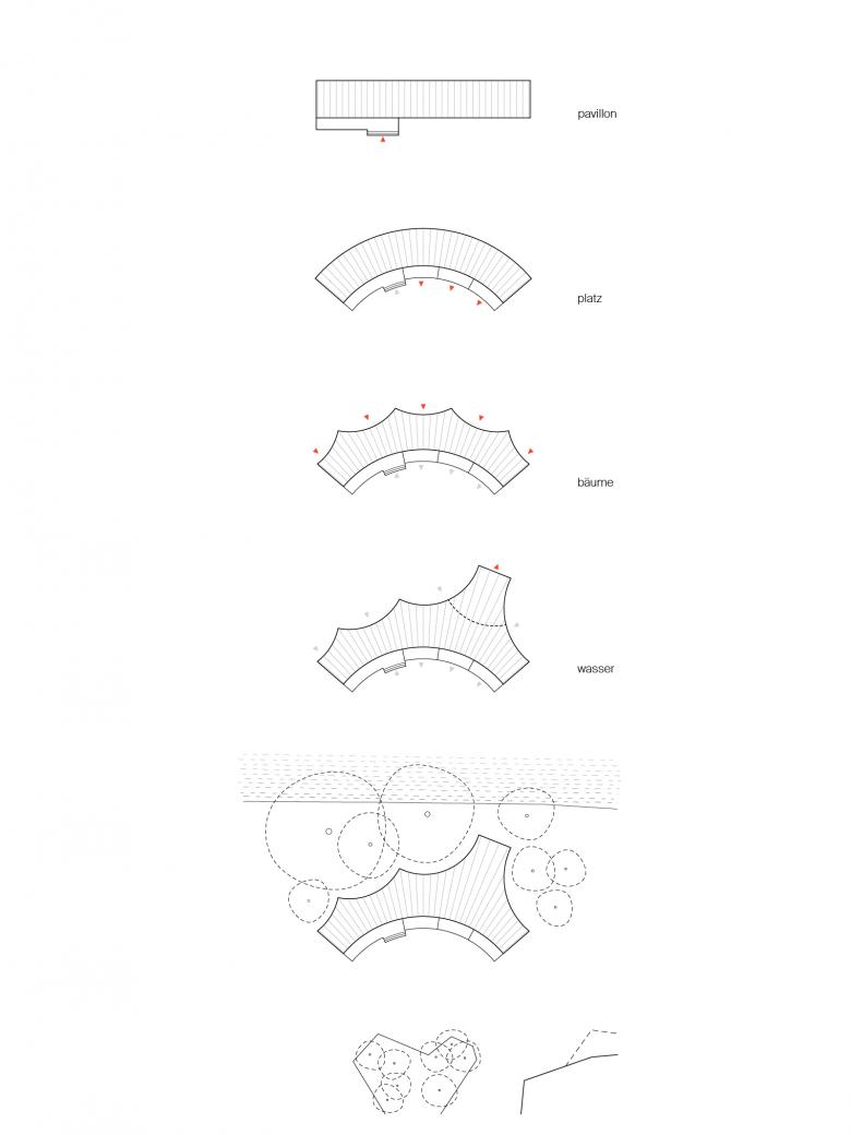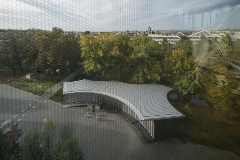 While the Experimenta square was already clearly defined by the two exhibition buildings and the Neckar riverbank, it now finds closure to the west with the pavilion’s curving facade. With its light canopy, the building acts as a modern 'Stoa' on the 'Knowledge Forum.' Stepped platforms provide seating and spaces for discussion, while also leveling the site's slope. The temporary pavilion is thus part of a permanent redesign of the public space concept by UNIOLA and von K landscape architecture, which includes extensive greening of the square: existing tree and seating islands are integrated into a continuous green area, and additional green zones serve as experimental fields for climate-appropriate planting.