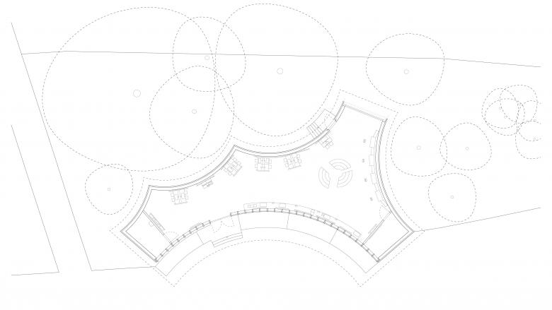 On the side opposite the square, the floor plan is defined by four smaller circular segments, which reflect the canopies of surrounding trees. Inside, these form thematic islands with interactive exhibits that delve deeper into various aspects of Artificial Intelligence. Between the islands, the space opens up, creating room for a central exhibit. Extending this area, the walls form a funnel-shaped opening with a panoramic window, offering views of the Neckar canal.