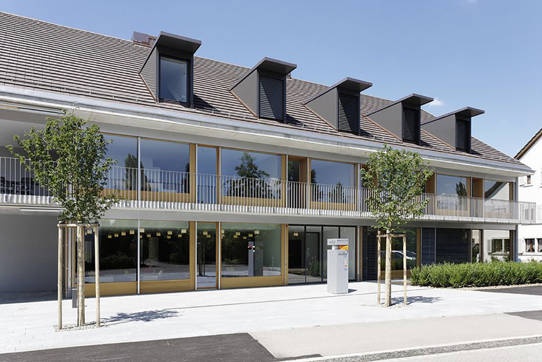 Verteilt auf die drei Gebäude sind drei Pflegeabteilungen, 13 Alterswohnungen in verschiedenen Grössen und die gesamte Infrastruktur des Alterszentrums. Natürliche Materialien und die grossflächigen Fenster sorgen für gut belichtete Räume zum Wohlfühlen.