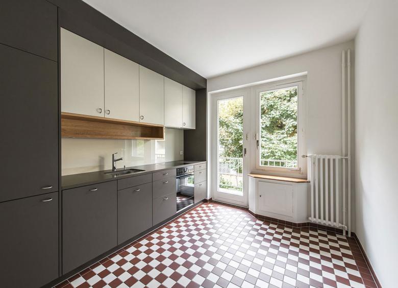 In diesem stattlichen Stadthaus mit Baujahr 1927 war noch vieles aus der Erstellungszeit. Doch Küchen und Bäder mussten dringend erneuert werden. Die originalen hölzernen Küchenbuffets und roten Sechseckfliesen konnten zwar nicht erhalten werden. Aber die neuen Fliesenbeläge mit ihrem sorgfältigen Schachbrettmuster erinnern an die ursprüngliche Wertig- und Farbigkeit. Die Küchenfronten sind in unaufgeregten Farben gehalten; dazu bringt ein Eichenholzregal Wärme in die Wohnküchen.