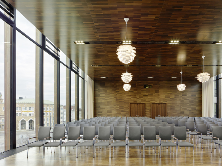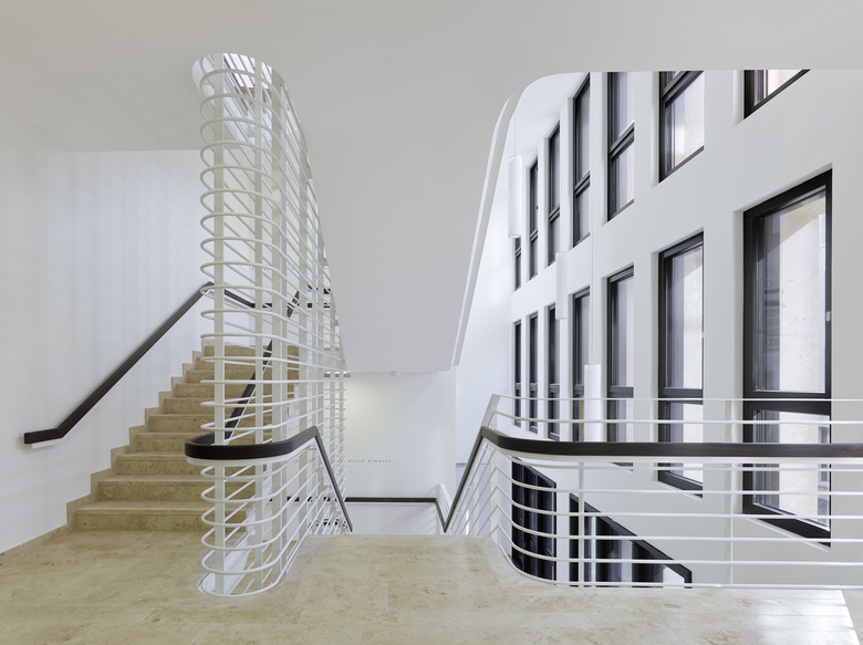 Mit seiner imposanten, steinernen Fassade aus hellem Dolomit und der Fortführung der vorhandenen Arkadensituation knüpft der neue Erweiterungsbau des Heilbronner Bankhauses konsequent an den bestehenden Gebäudekomplex an und integriert sich mühelos in die städtische Struktur entlang der Allee. Die Gesamtkomposition aus Bestand und Neubau erzeugt zwei gegenüberliegende Hofsituationen, so dass insgesamt eine ausgewogene Balance zwischen Baukörpern und Freiräumen entsteht. Der nach Osten geöffnete Grünhof schafft eine ruhige, entspannte Atmosphäre und kontrastiert zum Stadthof, der als attraktiver, lebendiger Aufenthaltsort zum Flanieren und Verweilen einlädt. Zwei, durch schmale Fensterelemente rhythmisch gegliederte Natursteinfassaden säumen den Eingang zum Stadthof. Der verglaste und hängende Sitzungssaal bildet das Bindeglied und schafft nicht nur einen wohltuenden Kontrast zur feingliederigen Architektur der Fassade, sondern auch eine natürliche Verbindung zwischen Innen- und Außenbereich.