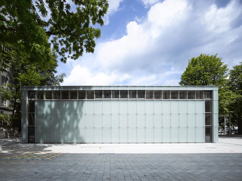 Den neuen Eingangsbereich und zugleich überdachten Schulhofbereich bildet die Pergola. Mit ihrer holzgetäfelten Decke bietet sie einen vielversprechenden ersten Eindruck auf die Ausgestaltung der Innenräume. Über den, sich über zwei Geschosse erstreckenden Nebenraumtrakt mit Umkleiden, Geräteräumen und Technik gelangt man schließlich in die sieben Meter hohe Halle. Nebeneinanderliegende Stege aus Furnierschichtholz mit Oberlagen in hell lasiertem Eschenholz in Sichtholzqualität prägen die Gestaltung der Wände und Decken der Innenräume und schaffen ein warmes, freundliches Raumklima. Kontrastierend zur Innenfassade erstrahlt die Außenfassade aus horizontal und vertikal geschuppten, semitransparenten ESG-Elementen in hellem, kühlen blau und verleiht der Turnhalle ihre moderne, individuelle Optik.