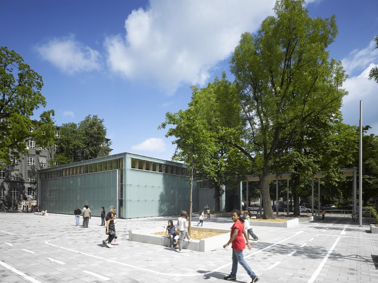 Die zweigeschossige, in Passivhausbauweise errichtete Einfeldturnhalle der Bonifatiusschule im Frankfurter Stadtteil Bockenheim bietet für Gruppen von bis zu 25 Schülern und Vereinssportlern ausreichend Platz für sportliche Aktivitäten aller Art. Für Aufbau und Konstruktion des Gebäudes fiel aufgrund des hohen Vorfertigungsgrades und der signifikanten Bauzeitreduktion die Wahl auf eine elementierte Holzrahmenbauweise. Gedämmte Holzrahmenelemente bilden die Außenwände und werden durch Innenwände und Trennwände aus massivem Brettsperrholz ergänzt. Das der Konstruktion zugrunde liegende Turnhallenbaukastensystem basiert auf insgesamt drei Grundelementen und kann entsprechend der jeweiligen standortspezifischen Anforderungen individuell zusammengefügt werden.