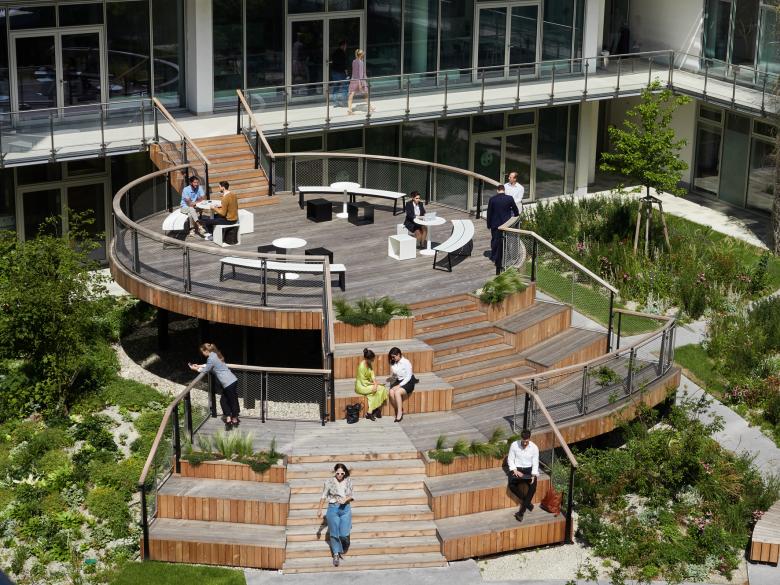 Die Kantine erweitert ihre Flächen in die Natur. Im Innenhof wird eine mit Holz verkleidete Terrasse für die Kantine errichtet. Als Grün-Oase für Mitarbeiter wurde der Innenhof mit Bäumen und Pflanzen aller Art bepflanzt und fügt sich zu einem erholsamen Außenbereich zusammen. Zusätzliche Beschattungselemente bieten an heißen Sommertagen einen Ort für Gespräche und Pausen.