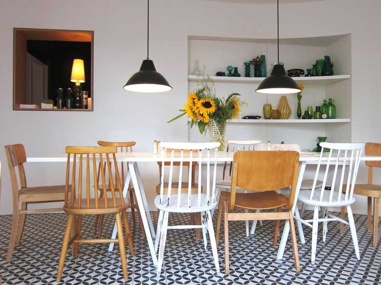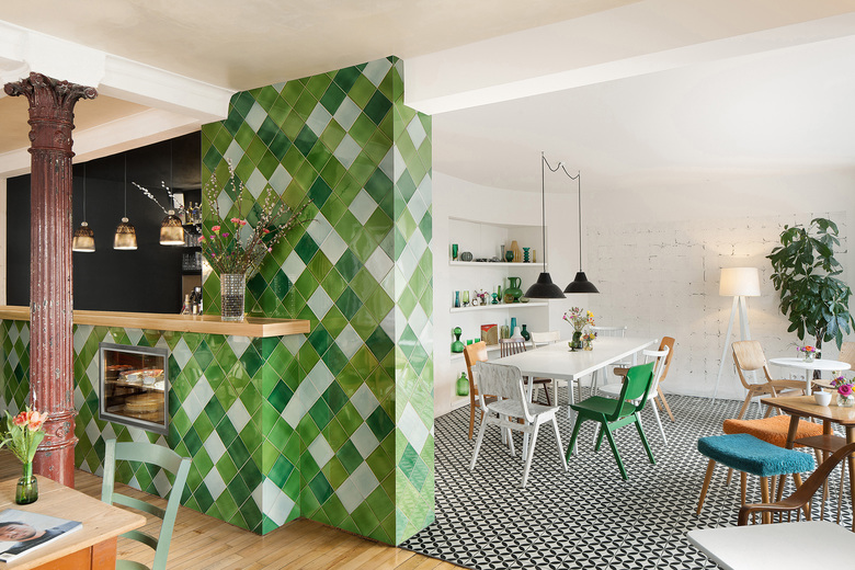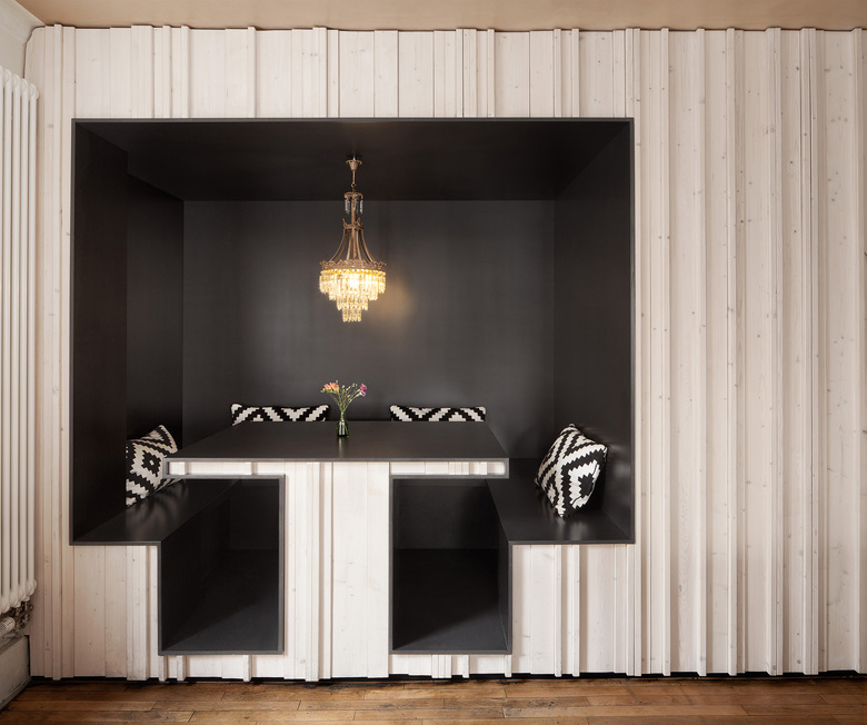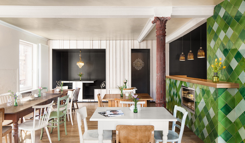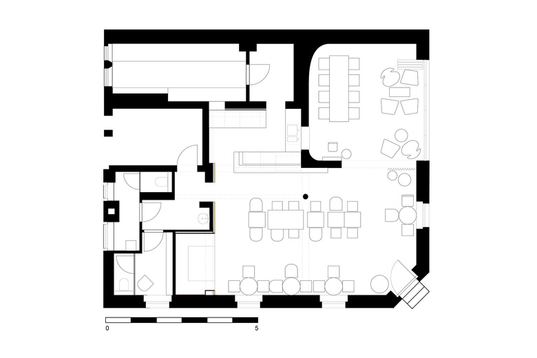 Restaurant in the West of Stuttgart - The casual, undisturbed inviting effect of the interior, which is made up of set pieces of various simple wooden chairs and tables, is based on the claim to create a public space that conveys privacy.