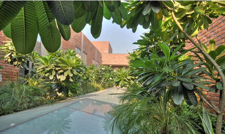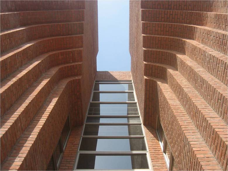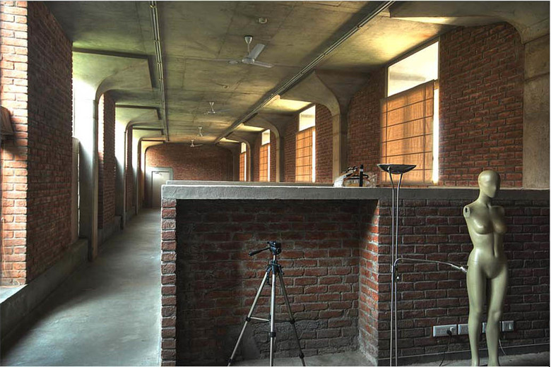 It will be a RCC Structure using large mushroom columns and flat slabs above them, offering beam ridden working space offices with good height. The main studio areas will get a double height space with The one side of the hall looking from below, at the hanging gardens on the either side of the courtyard. The project will use only exposed bricks for external facade giving the precinct a warm character.