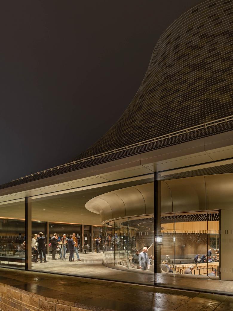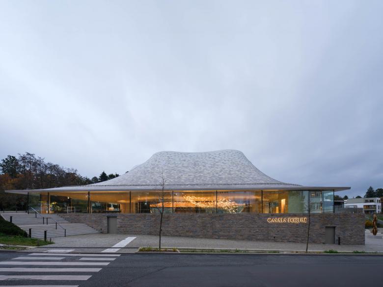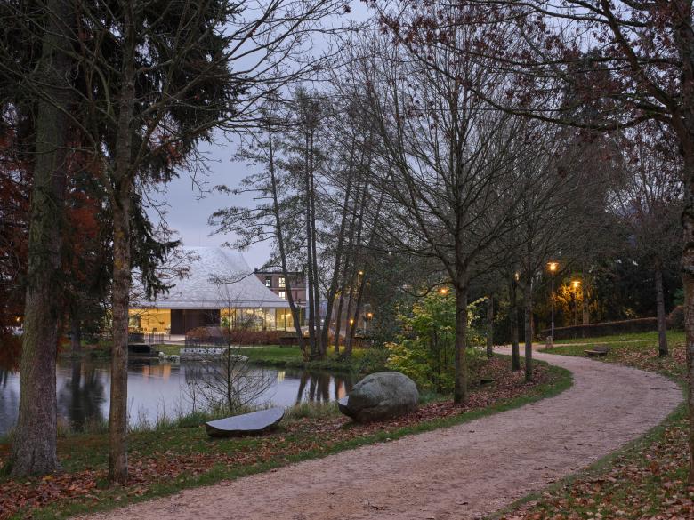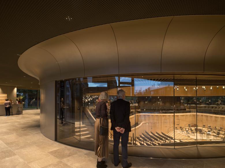 The building ensemble next to the rapid-transit station of Kronberg is surrounded by the green of Viktoriapark. The steep slope and the challenge to bring the new buildings into unison with the scale of the surrounding buildings lead to a topographic design approach. The chamber music hall and the hotel will have a base made of natural stone that emerges from the terrain, whereas the music academy is pushed into the slope and appears merely as a stone wall. The stone walls create an exciting alternation of open and enclosed exterior spaces on the way from the train station forecourt to the interior of the quarter. The hotel at the train station marks the beginning of the ensemble with a finely articulated wooden facade. The chamber music hall at the apex of the site concludes the ensemble with a far cantilevering roof. A large interstice made of glass separates the concert hall's roof from its stone foundation, the tiers embedded in it. The glass interstice lets the surrounding landscape become part of the clad-in-wood music hall and emanates its warm light to the outside.