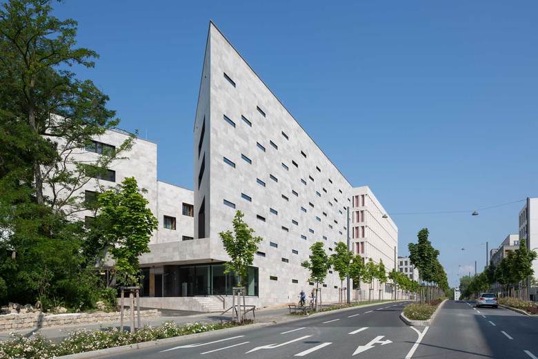 Aus einem erdgeschossigen Sockel, der alle Teile des Gebäudes über einen Kreuzgang zusammenbindet, werden für die unterschiedlichen Institutsbereiche mehrgeschossige Baukörper entwickelt. Die Anordnung und Orientierung dieser Baukörper richtet sich nach den funktionalen und räumlichen Anforderungen der verschiedenen Funktionsbereiche. So riegelt das Freihandmagazin gleichsam als Lärmschutzwand den Blockinnenbereich von der viel befahrenen Hansaallee ab. Die dazu gehörigen Büroarbeitsplätze sind in den ruhigen Innenhof orientiert. Die Projektbüros liegen zum Park nach Süden ausgerichtet, mit Blick auf das zentrale Gebäude der IG Farben. Der Wohnbereich liegt in der nordwestlichen Ecke des Grundstückes, und orientiert sich mit seinen Wohnräumen ebenfalls in den Hof.