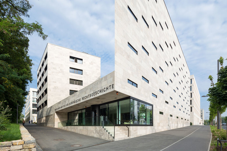 Bei dem städtebaulichen und architektonischen Konzept für das Institut für europäische Rechtsgeschichte ging es darum, eine Balance zu finden zwischen dem verständlichen Anspruch der Max-Planck Gesellschaft nach Eigenständigkeit und der städtebaulichen Intention, auch diesen Baukörper als Teil des Ensembles des neuen Campusgeländes mit dem dominierenden Bau der Zentrale der IG Farben zu begreifen.