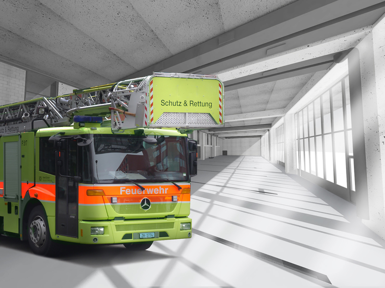 Was wäre der Flughafen Zürich ohne eine Feuerwehr? Das Gebäude dazu ist pragmatisch. Eine Ebene Handwerk, eine Ebene Fahrzeuge, eine Ebene Wohnen. Unten die Arbeit, oben das Vergnügen und die Erholung. Alles ist praktisch, robust, strapazierbar, ökonomisch, clever. Abgestimmt auf die Bedürfnisse. Der rechteckige Körper wird seitlich aufgeklappt, genannt Vordach. Dazu wird er ausgeschnitten, damit es Luft zwischen den Ruhe- und Schlafräumen gibt. Materialien und Farben unterstützen Organisation, Atmosphäre und verbinden die Ebenen.