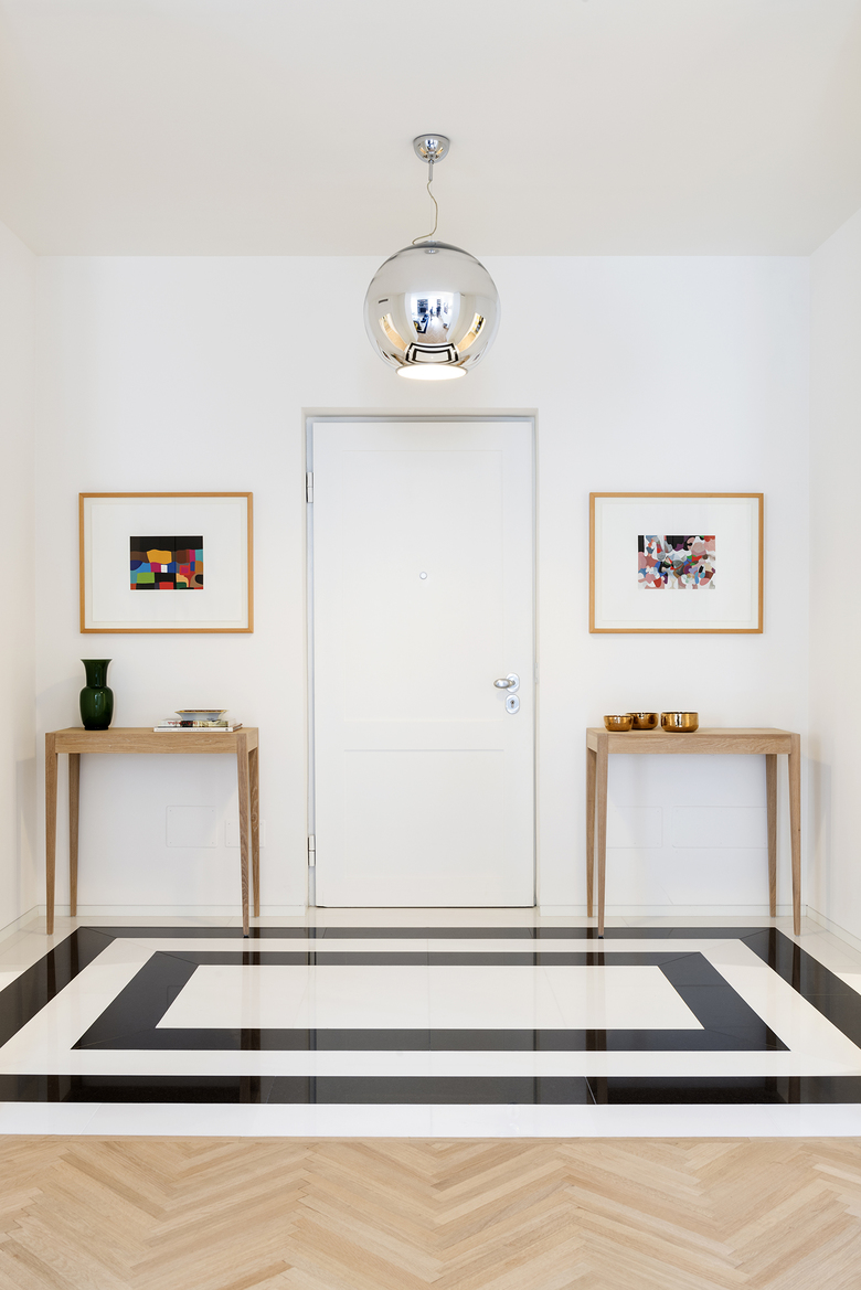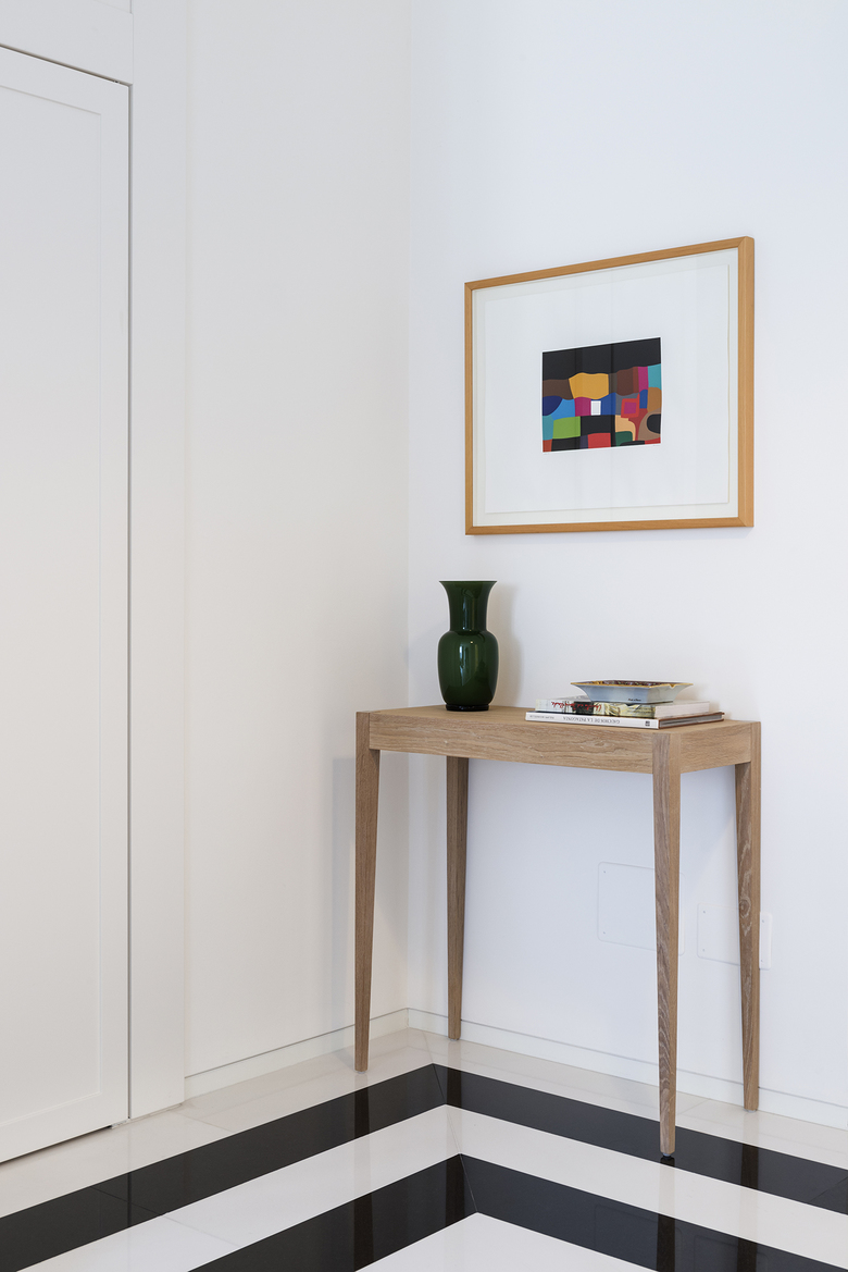 L’ingresso è un tappeto che accoglie il visitatore nel baricentro geometrico dell’intero appartamento. Ne riflette la simmetria dei percorsi che lo attraversano, di cui costituisce il crocevia.