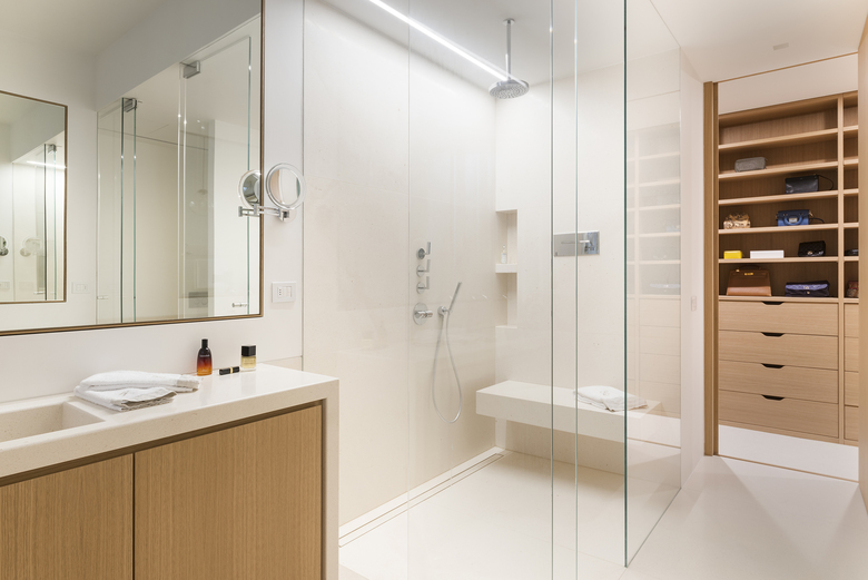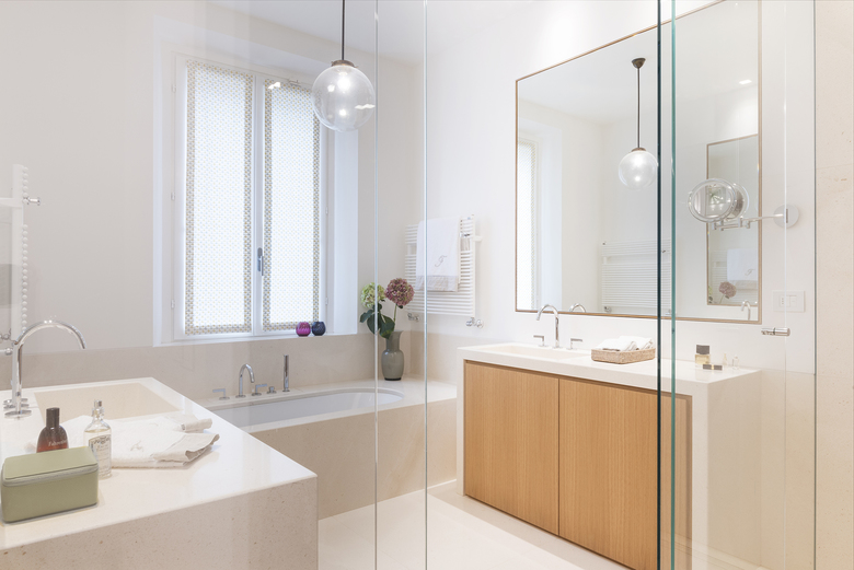 Anche la sala da bagno, una vera e propria stanza per il wellness, è organizzata secondo ambiti ben definiti e separati da pareti vetrate.