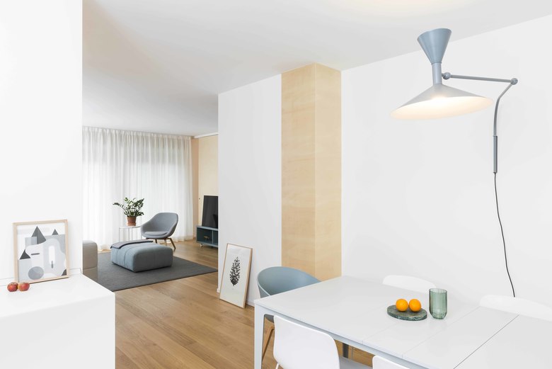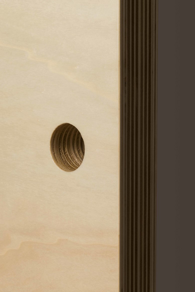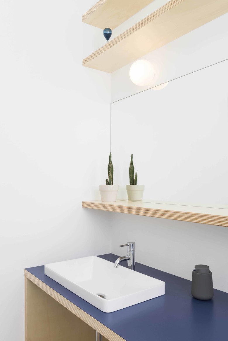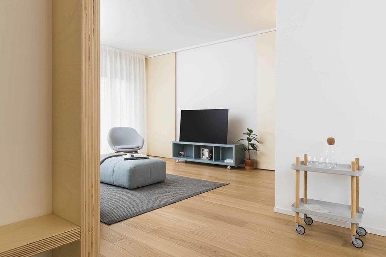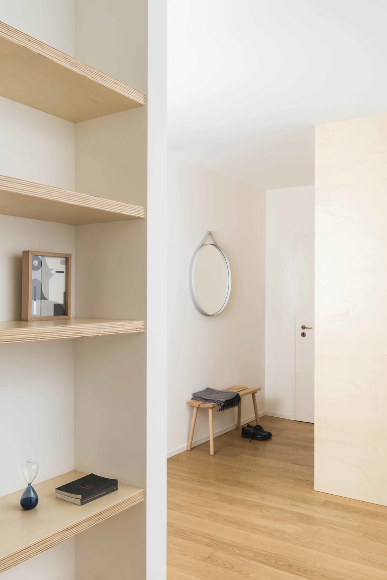 In un gioco di prospettive e visioni di scorcio l’introduzione di elementi monomaterici in multistrato di pioppo, come porte e altri dispositivi d’arredo, produce continui rimandi visivi tra i diversi ambienti della casa. Le porte scorrevoli del soggiorno si muovono quasi a costituire delle quinte teatrali.