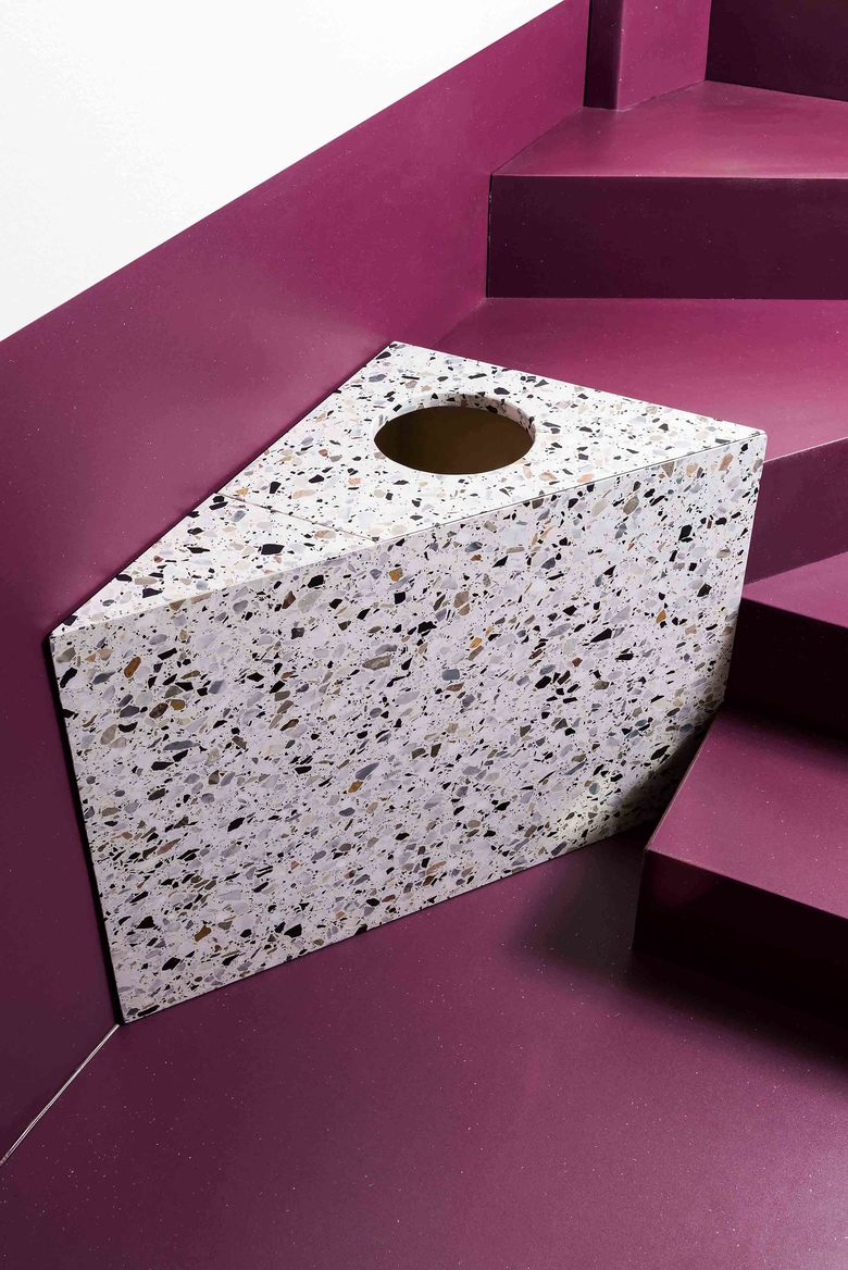 Il bancone dei gelati dalla forma squadrata e monolitica è rivestito da lastre di graniglia, un materiale semplice che rievoca i valori genuini della tradizione.