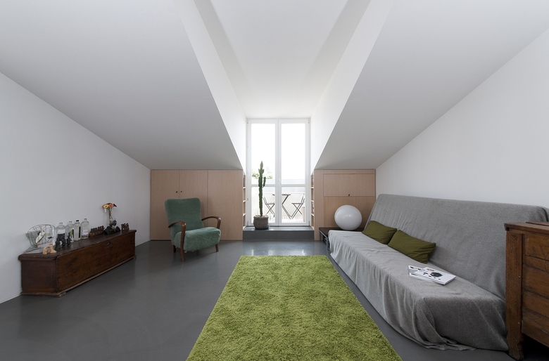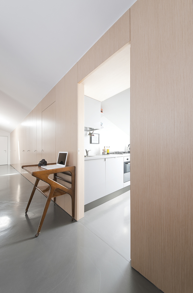 L’appartamento è caratterizzato dalla presenza di un unico elemento di arredo fisso, un diaframma che divide i differenti ambienti e funge da contenitore.