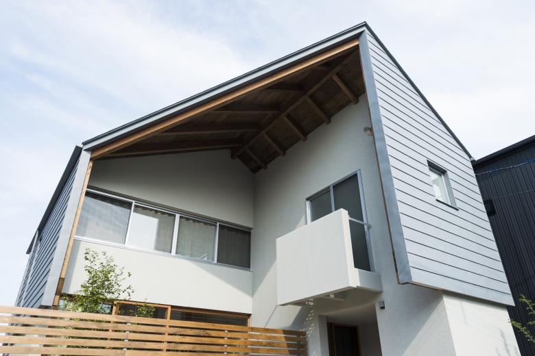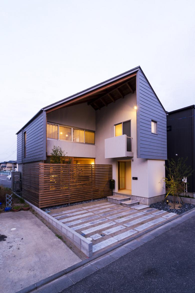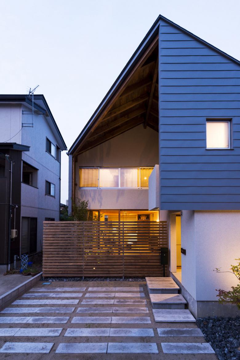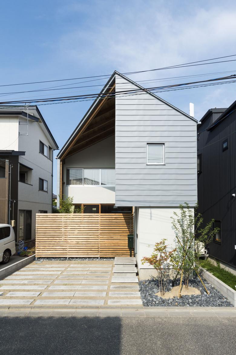 Sharing a road in front of the site with several surrounding plots, children are playing on the road as if it were a park without traffic passing through. In such a townscape, a large roof exposing wooden framework toward the road in front characterizes the two-story wooden house.