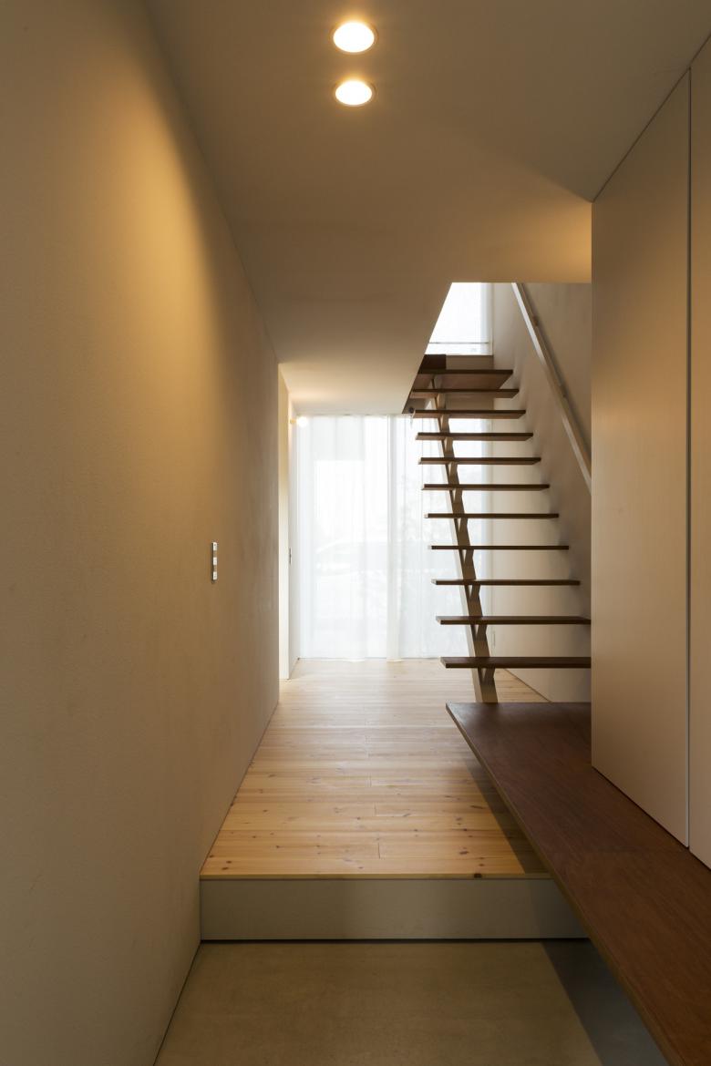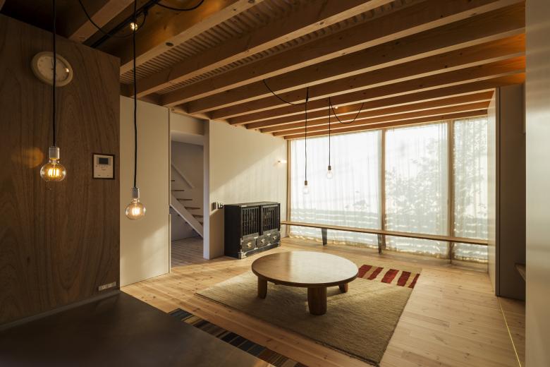 Making good use of natural energy with large wooden sash for letting in warm sunlight in winter and lattice floor for vertical ventilation: air flow from the ground floor to the top light, and relying only on the air-conditioning, Cardigan Cardigan!! is aimed for a compact and passive house covering with large roof.