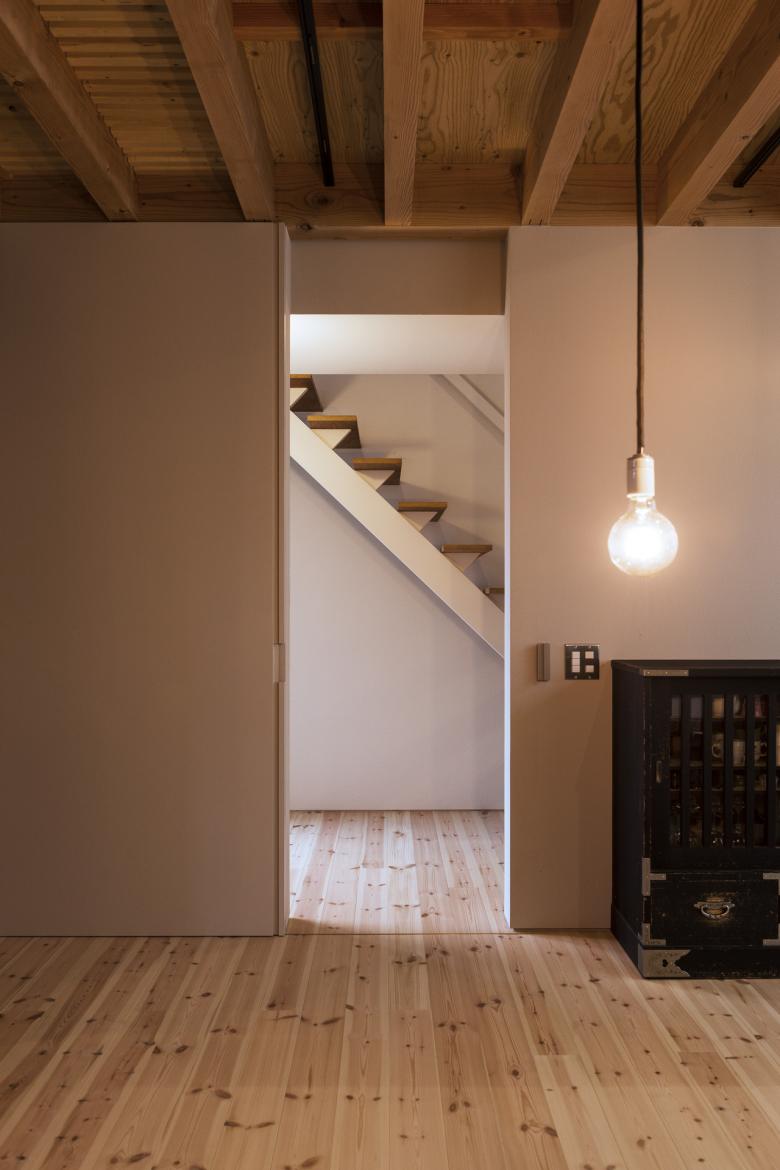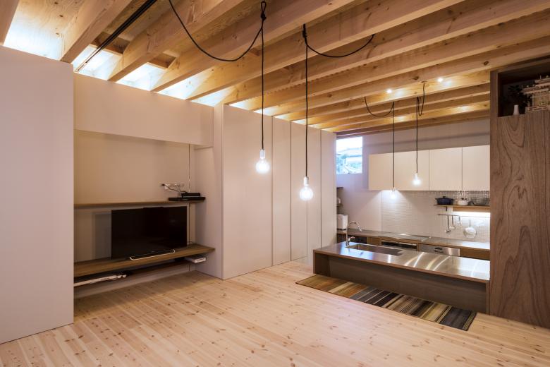 The plan is simple: residents are mostly staying in LDK and sitting on the floor on the ground floor, and taking a rest in their private rooms on the first floor. We designed the room for choosing moderate distance among the family, which is often uniformly fixed, by creating a variety of places to attract people: extreme thinness and closeness between the ground floor and the first floor, a long corridor leading to the space under the large roof and a corner or a step everywhere.