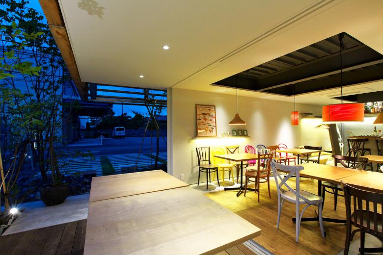 The three story building is steel-framed, employing round steel bar bracing. The first floor is occupied by a restaurant, which spills out into a park-like outdoor dining area. The second floor comprises office space, enclosed by trees rising up from the garden below. Within this area is a large central table seating eight - conducive not only to office work but also less formal gatherings. The third floor houses a multipurpose rental space incorporating a kitchen and bathroom, which opens onto an outdoor area.