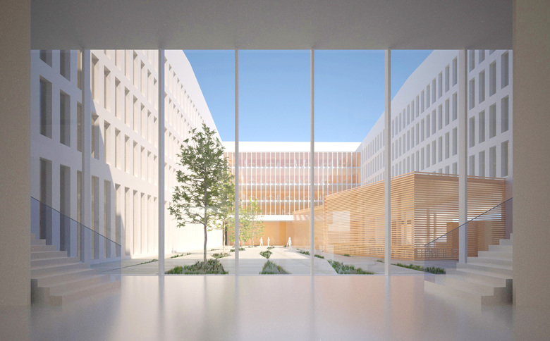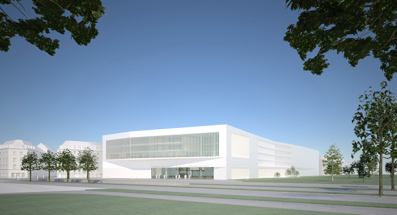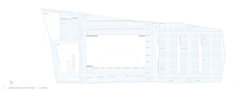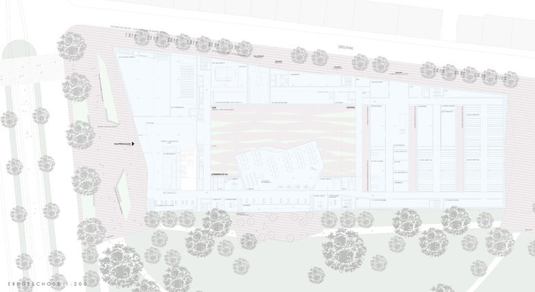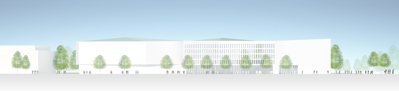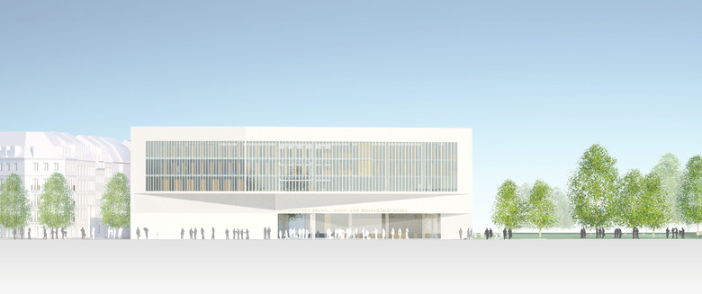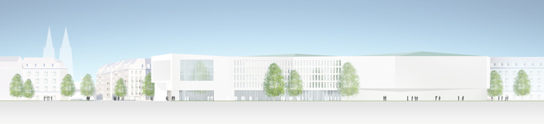 Für den Neubau des Historisches Archivs und der Kunst- und Museumsbibliothek wird ein markanter Solitär vorgeschlagen, der den geschichtsträchtigen Kölner Institutionen in der Stadt- und Parklandschaft an der Luxemburger Straße ein neues Gesicht und eine eigenständige Identität zuweist. Der in Außenhaut und Dachform bewegte Baukörper verbirgt im Inneren einen klar gegliederten syntaktischen Grundrissaufbau in orthogonaler Ordnung, der nach dem A-B-C-PRINZIP in drei Bereiche gegliedert ist. An der Luxemburger Straße bilden das Foyer mit den öffentlichen Bereichen sowie dem Lesesaal und der Freihandbibliothek eine Raumskulptur. Die bedingt öffentlichen Bereiche der Verwaltungen und Werkstätten der beiden Institutionen sind in zwei zweispännigen Gebäudeflügeln untergebracht. Der nichtöffentliche Sicherheitsbereich schließt sich als geschlossener Monolith in Südwestrichtung an. Mittels der durchgängigen Architektursprache in Form (Knicke) und Materialität (Glasfaserzementtafeln) werden die drei Funktionsbereiche zur einem selbstbewussten Solitär zusammengefügt, dessen offener und einladender Charakter im Stadtraum an der Luxemburger Straße durch das im Eingangsbereich zurückweichende Gebäudevolumen gebildet wird. Die Obergeschosse bilden hiermit einen plastischen Übergang zum Stadtraum, wodurch das Haus auch mittels eines großen Stadtfensters im Bereich der Freihandbibliothek den Kontakt zu den Kölnern und den Besuchern sucht. Seine einmal geknickt Fassade in diesem Bereich ist Ausdruck der Dualität der Nutzungen einerseits und andererseits ein harmonischer baulicher Ausdruck am Übergang zum neuen Teil der Park-Gliederkette des Grüngürtels.