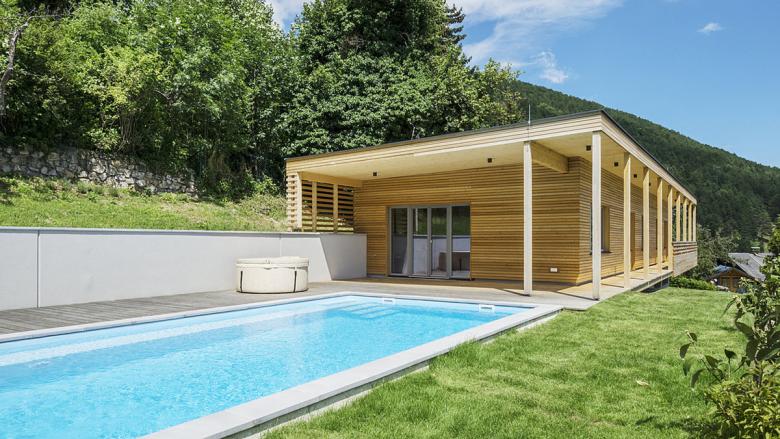 Die Konstruktion aus Brettschichtholz steht auf einem zur Straße offenen Betonsockel, der als offene Garage und zur Unterbringung haustechnischer Anlagen genutzt wird. Im Gebäudeinneren bleibt der Holzwerkstoff spürbar.