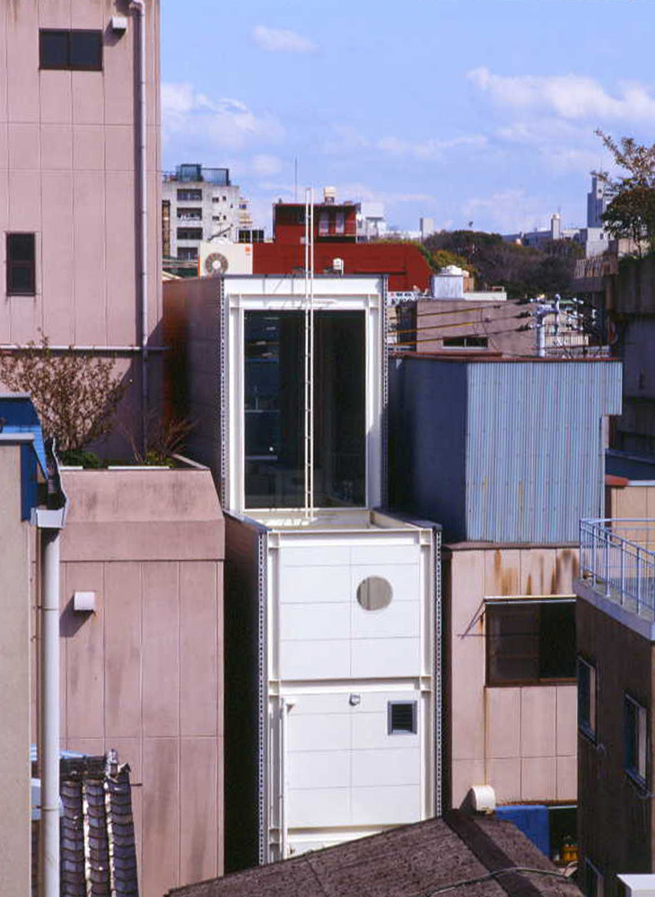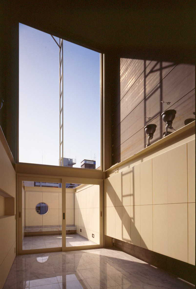 This house was built on an extremely small plot of land in downtown Osaka. Measuring 2.5m, the facade of the building fills the entire front of the site. The house is 13m deep, and as for the lower three floors ceiling heights were kept as low as possible. This construction is topped by the upmost floor, where the dining room is located. With a 6m-high ceiling, the dining room occupies as much as two-thirds of the entire building plan; the remaining third of the depth is filled by a terrace as an open-air space. As a result, the entire structure reverberates the depth of the small-breasted site, as well as emphasizes the vertical direction. The building features two main topics. One is the verticality of urban life. The other one is the creation of a floating living space the top floor, separated from the din of the street and close to Nature. For all this, no more was needed than a few square meters of terrace space and about 30 square meters of building space, including the generous dining room. What I tried to do in designing this house was to give new meaning to the concept of a rooftop garden.The building at once provides the sensation of a privileged view and a unique feeling of being afloat. This, I think, is the precious quality that would not be without the modern concept of space, or more specifically: the rooftop garden.