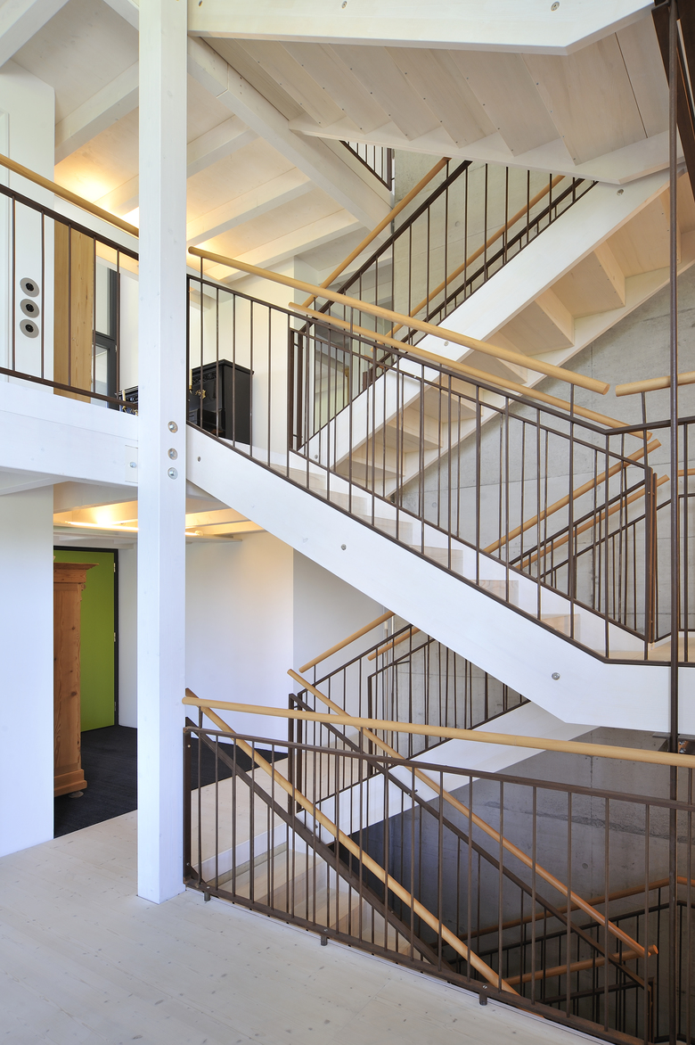Die Holzelement-Konstruktion wird durch einen Turm mit den Sanitärzellen aus Ortbeton ausgesteift. Das integrierte Atelier könnte als separate Wohnung genutzt werden.