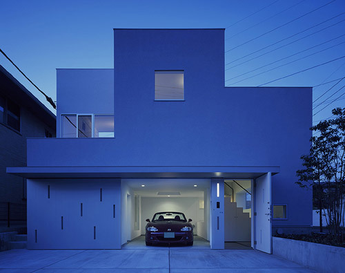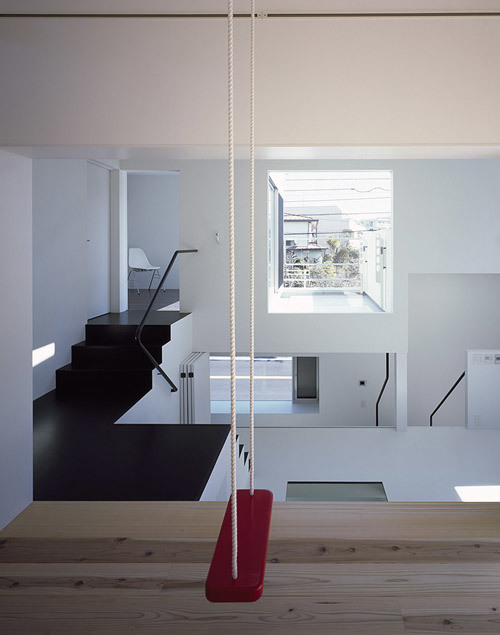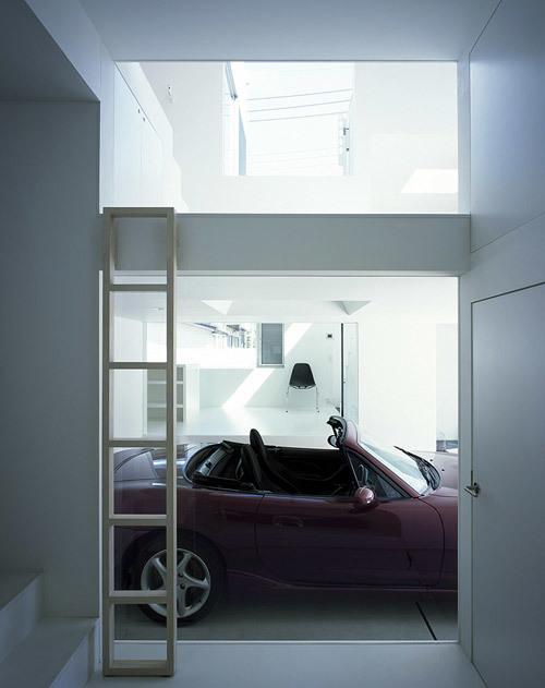 The house is for a family of four: a husband who enjoys cars, a wife who is a pastry chef, and an energetic 6-year-old girl and 3-year-old boy. The husband wanted a built-in garage for his convertible car, and the wife wanted a large kitchen visible from the street where she could hold cake classes. The children also innocently said they wanted a swing set in the children's room and a glass floor that would allow them to see the floor below.