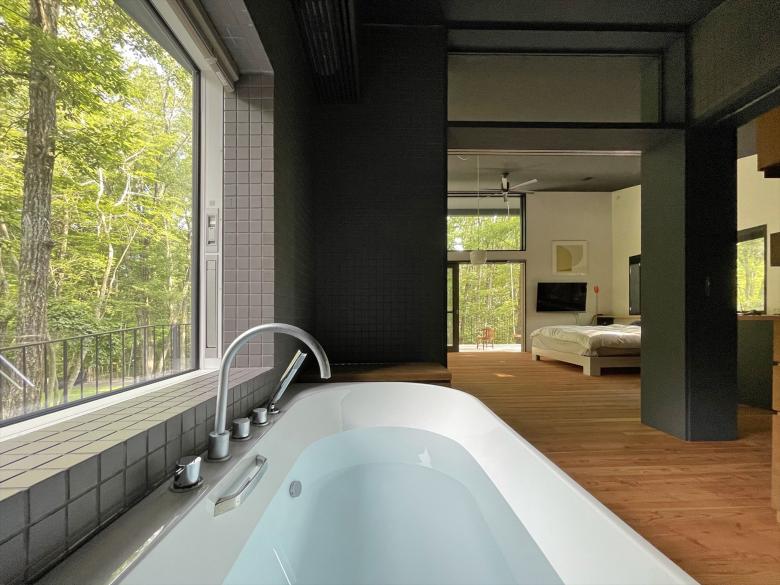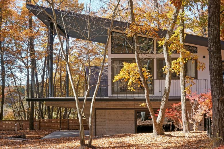A house located in the forest of Karuizawa, Nagano Prefecture. Karuizawa is a very popular place as a mountain resort in Japan. The site slopes gently to the south with Mt. Asama in the background. It is an area that is said to have been damaged by pyroclastic flows due to the eruption of Mt. Asama about 900 years ago, and lava stones called “Asama stones” appear immediately after digging the site. Therefore, the water drainage is good, and it is an area with relatively low humidity in Karuizawa. The car approaches the south side of the building from the east and south roads through the trees of Quercus crispula and Quercus serrata, and fits under the eaves on the first floor. The shed roof extends about 20m with the north side under the water for the reason of taking in the sunlight on the south side and not dropping snow on the parking lot. This proportion was decided from the plan of the part where the ceiling height is low and the shade regulation to the adjacent land. The outer corridor, which continues from the large deck-shaped balcony on the south side of the second floor, goes around the building while shifting according to the slope of the roof. The floor level of the second floor is partially different in the building according to this continuously changing roof slope too. On the first floor, a semi-public space that looks like a combination of the entrance hall, office, and guest room is planned while changing horizontally / X-axis and Y-axis (sometimes popping out). Then, on the north side of the building, it connects to the second floor through a stairwell extending in the vertical direction / Z axis. The second floor, which changes the form to the Z axis, also creates a space where they can coexist by unifying the flooring with wood in the private space where the bed, kitchenette, dining table and bathtub are placed. The opening is mainly on the east side to take in the morning sunshine and because of the good view of the surrounding scenery. The structure was a mixed structure, so it was important to balance the wooden and concrete structures. Specifically, the large outdoor decks, pillars and beams in the private space on the second floor with a high ceiling and no pillars, and RC walls and beams on the first floor that are conscious of the second floor. The facilities are equipped with FF type(Forced Draught Balanced Flue) heating with kerosene in the main living room, heat storage type floor heating on the first floor, and wall heating on a part of the wall on the second floor. Therefore, the plan is to make it available to owners who frequently travel to and from Tokyo throughout the year. In the exterior plan, an outdoor space is formed with local Asama stone on the east side while making use of existing trees. The continuity of the wooden approach on the first floor, the outer corridor on the second floor, and the eaves of the roof overlap in three layers. They cut out the scenery while spreading in the sky, and the diagonal lines can be felt from the interior too.