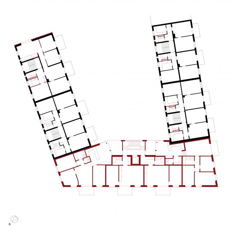 Jeweils vier Wohnungen sind pro Geschoss vorgesehen. Zwei Familienwohnungen besetzen die Ecken des Blockrands und profitieren somit von einer dreiseitigen Ausrichtung. Dazwischen werden zwei altersgerechte Kleinwohnungen angelegt.