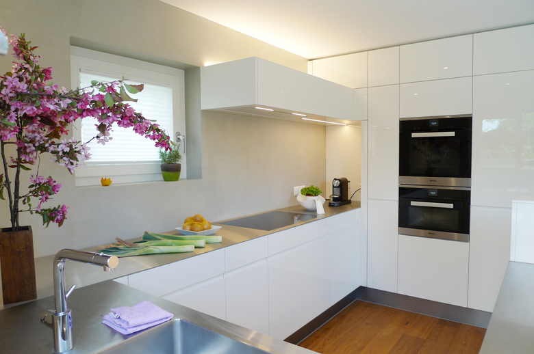 Die neue Küche besteht aus hochglanzlackierten Elementen, die das Licht von aussen reflektieren und den Raum indirekt beleuchten.