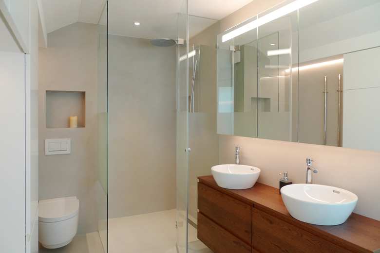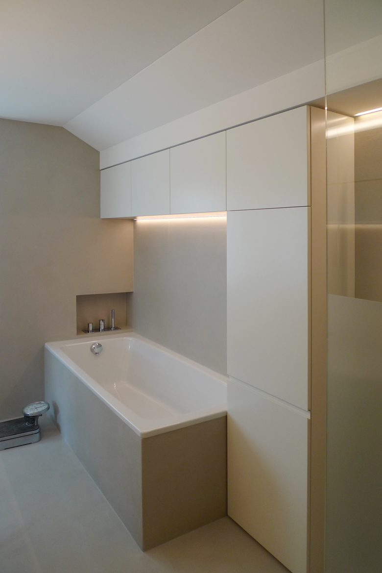 Um den Wunsch der Bauherrschaft nach viel Stauraum zu erfüllen, wurden massgefertigte Möbel über der Badewanne montiert.