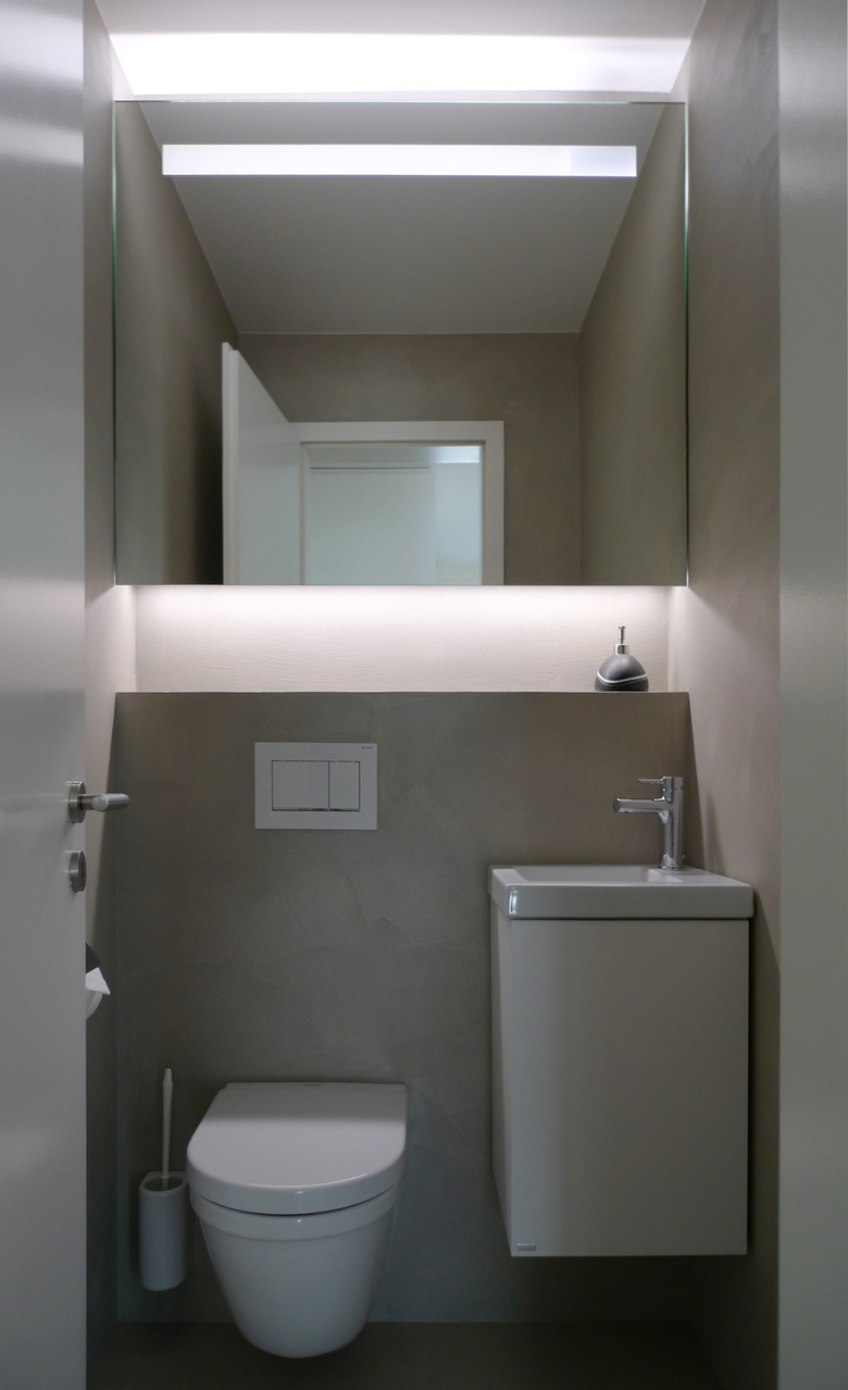 Die Wand- und Bodenplatten wurden auch hier durch eine fugenlose Beschichtung ersetzt. Der neue Spiegelschrank und der neue Unterbau wurden nach Mass gefertigt und mit dimmbaren LED-Streifen ausgerüstet.