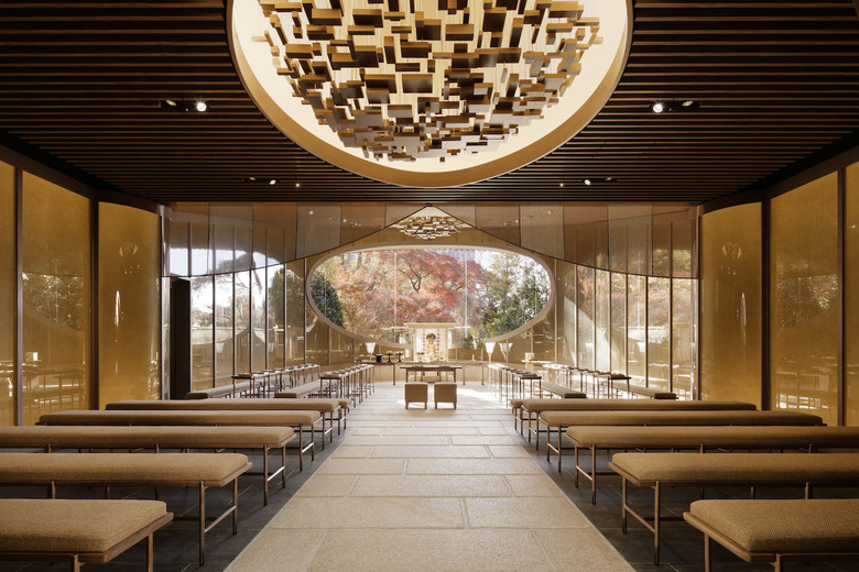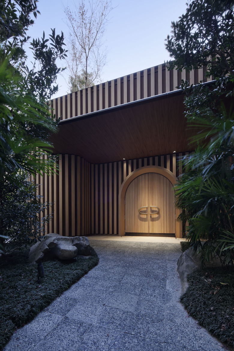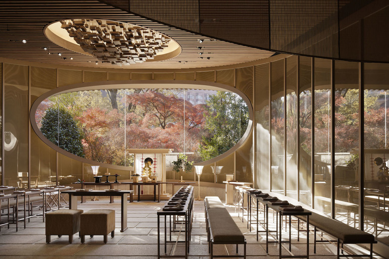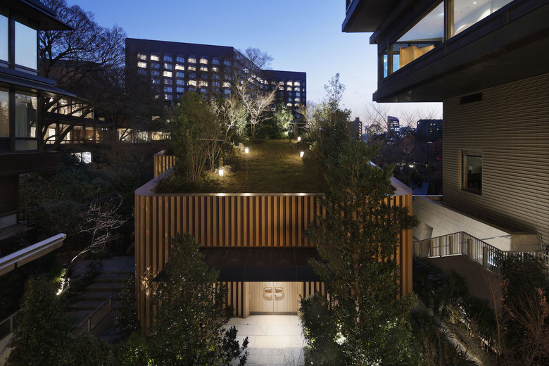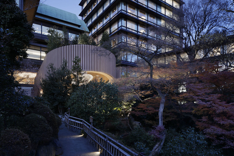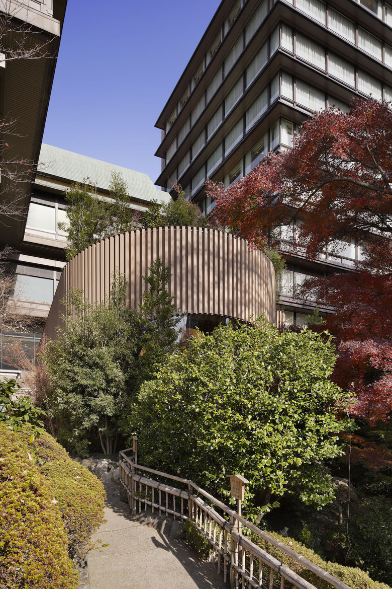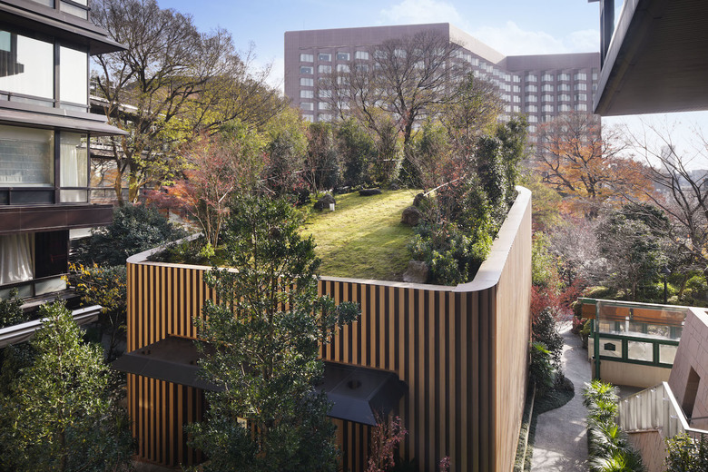 Se construyó un nuevo santuario en una pequeña colina del jardín del Hotel Chinsanzo Tokio, un lugar pintoresco en Tsubakiyama [Monte Tsubaki]. Para este edificio creamos un jardín en la azotea plantado con camelias, la flor que da nombre a la montaña. El verde diseño del jardín aprovecha los árboles existentes para que se integre plenamente en el jardín del Hotel Chizanso.