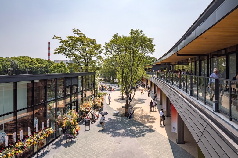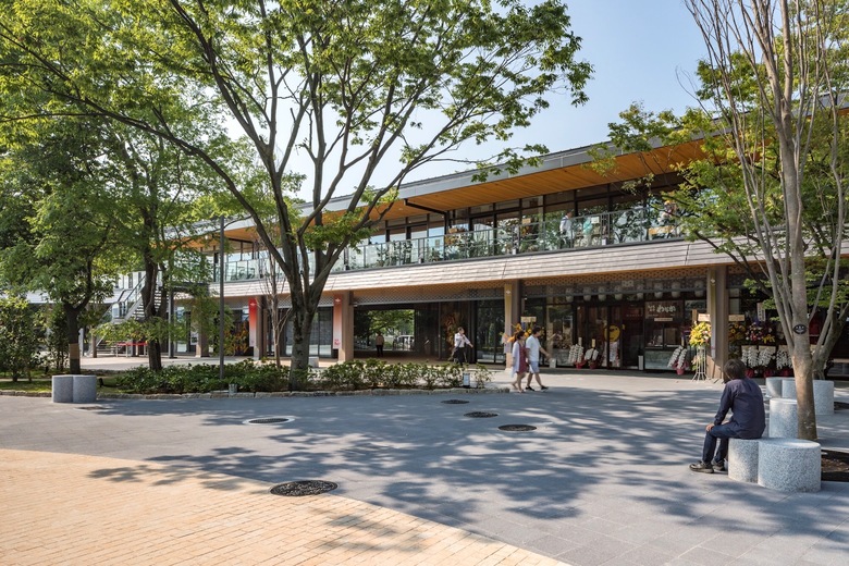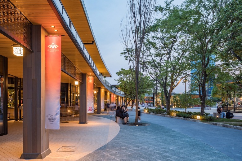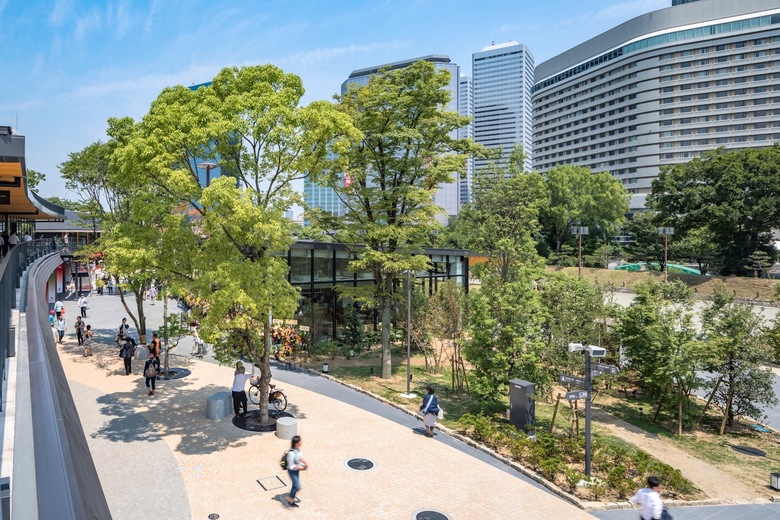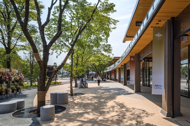 Situado frente a la estación del Parque del Castillo de Osaka, JO-TERRACE OSAKA es un espacio de entrada al oasis urbano y sitio histórico del Parque del Castillo de Osaka. El Castillo de Osaka original se construyó en el siglo XVI, y ha sido un símbolo de Osaka desde entonces. Intentamos conservar los árboles existentes en la medida de lo posible para que se integrara en el bosque circundante. También mezclamos plantas de temporada para dar la bienvenida a los visitantes de dentro y fuera del país. Para celebrar la historia de Osaka como acuápolis, el diseño del pavimento se inspira en un río cercano.