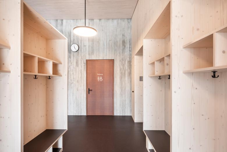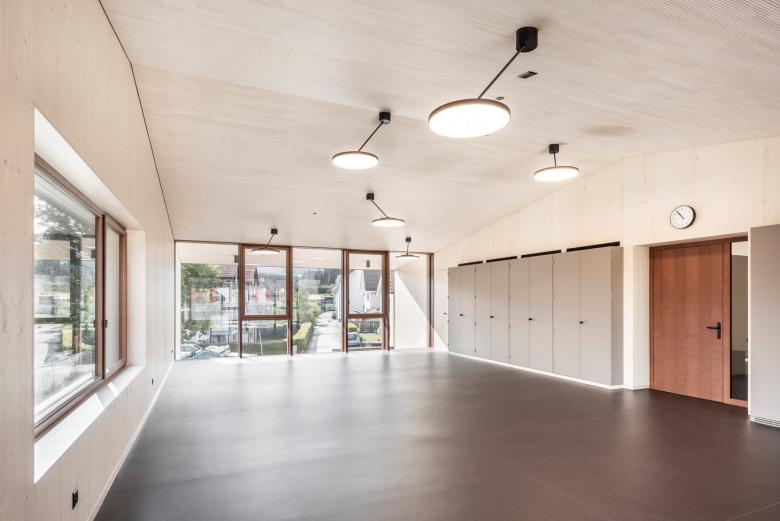 Seitlich befinden sich nutzungsflexible Haupträume. Der mittlere Teil mit den Nebenräumen und Garderoben verbindet die beiden Haupträume mit dem Aussenbereich. Im Süden bilden die markanten Vordächer einen gedeckten Spielraum und beschatten gleichzeitig die vollverglasten Fassaden.