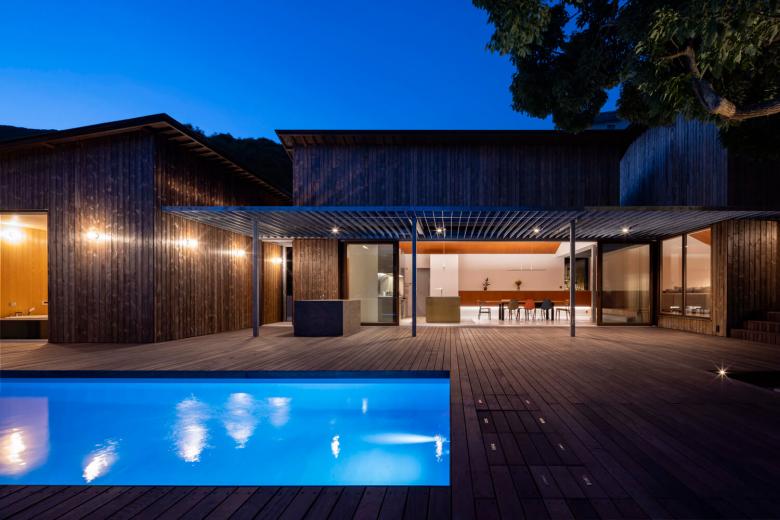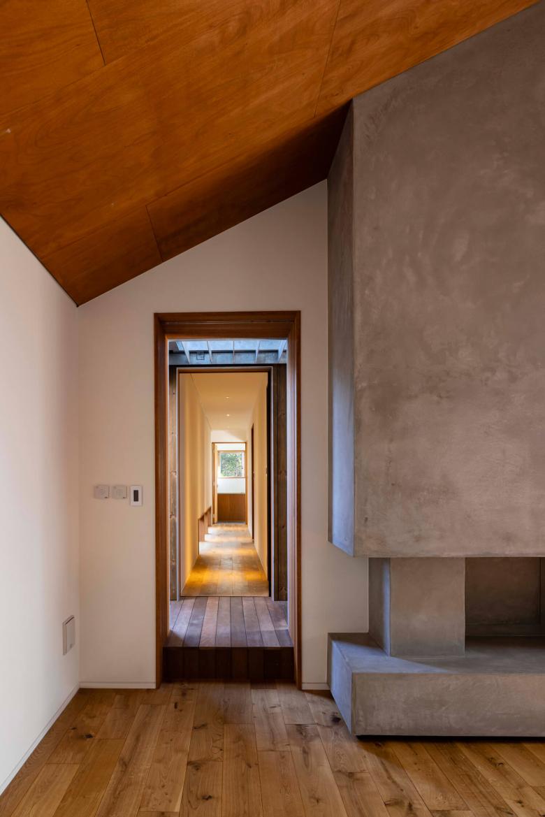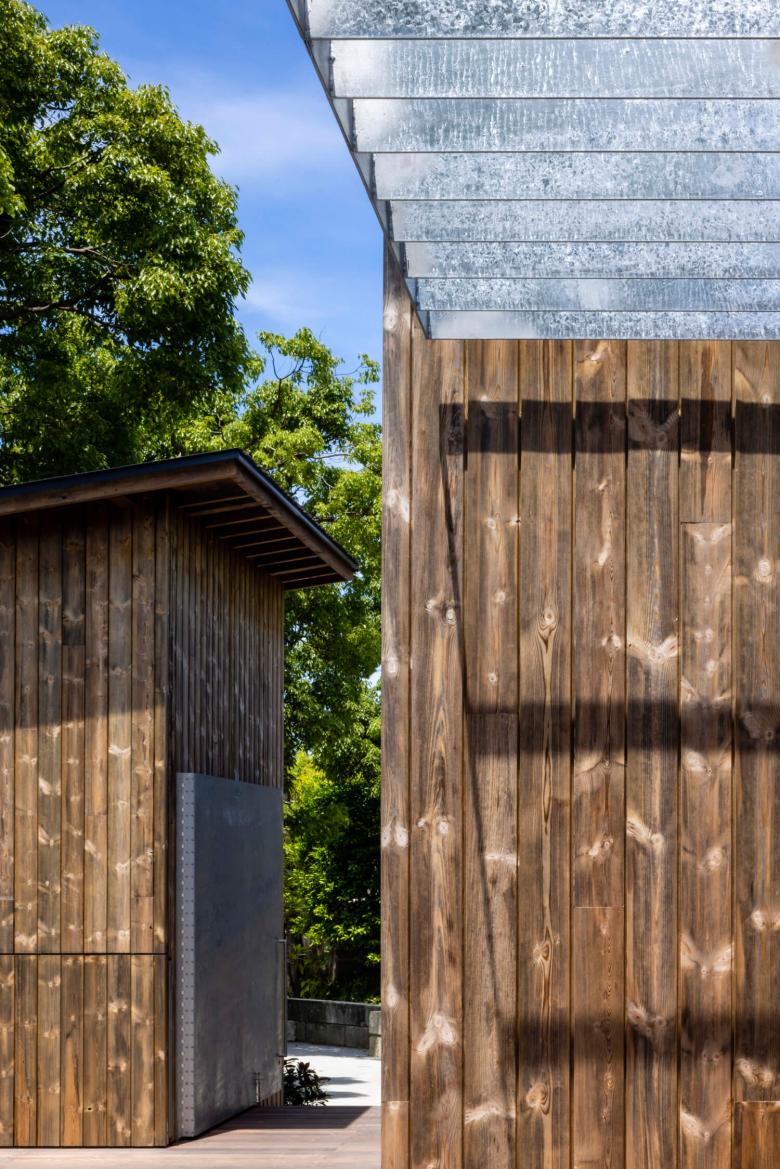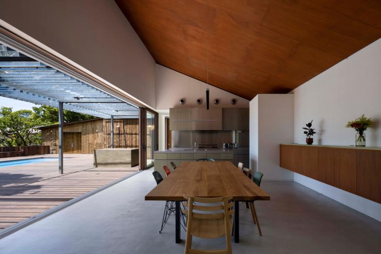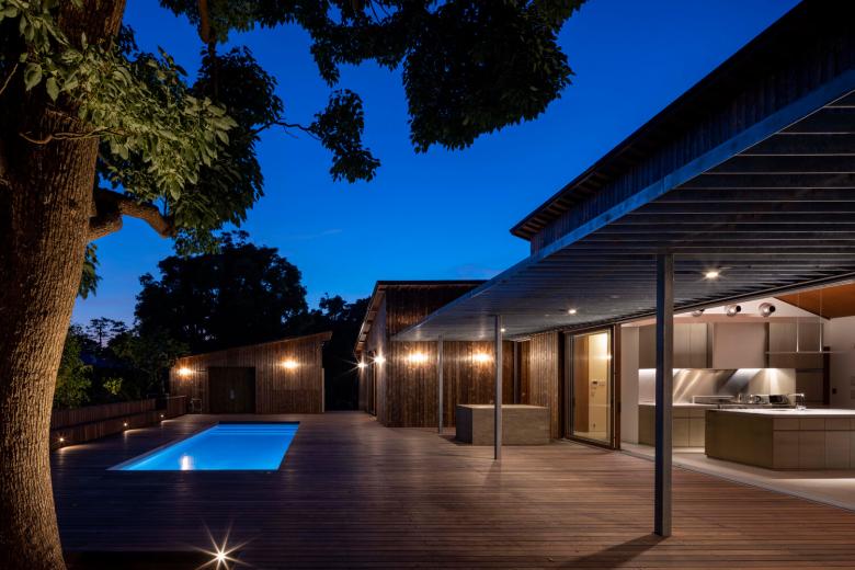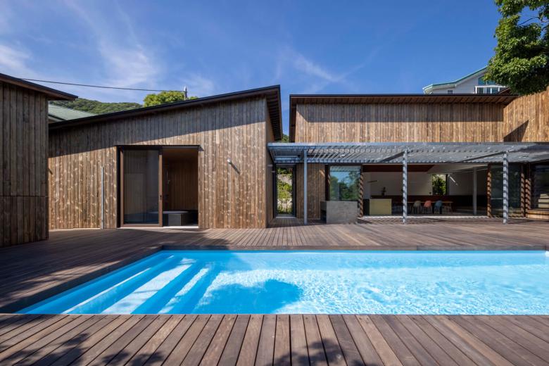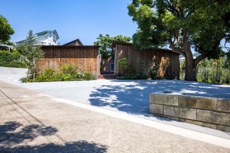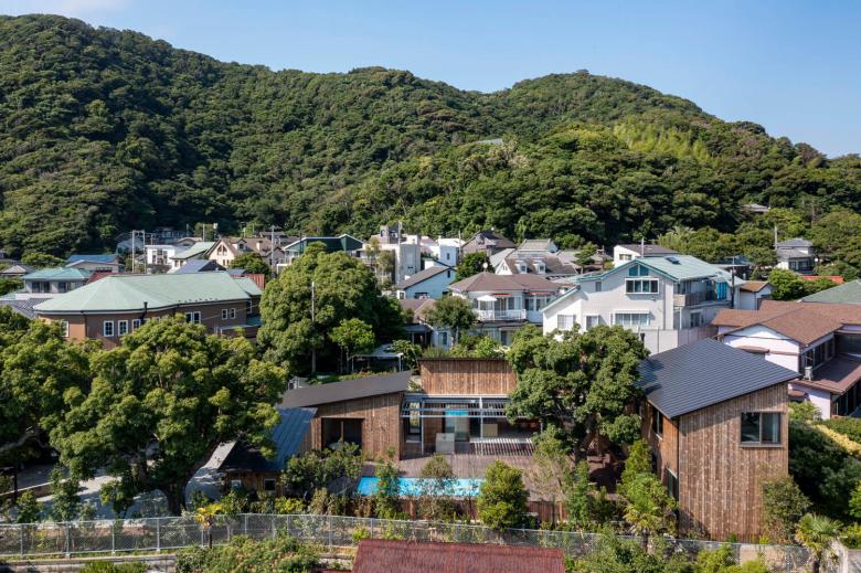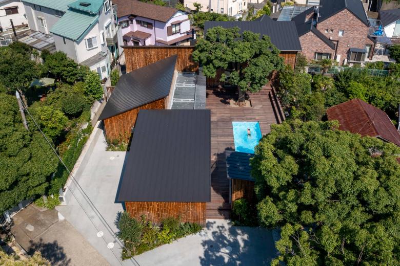 この別荘ではプールが計画されたため、北側や東側に対して建物ヴォリュームを建てて、プライバシーを確保するように検討した。隣接する住宅に威圧感を与えないように分棟とし、ダイニング棟、リビング棟、宿泊棟、駐車場と浴室のあるサービス棟、倉庫棟の5つの棟がプールのある中庭を取り囲み南の海側に開いた構成とした。各棟の高さは基本的には内部の機能に合わせているが、それぞれの屋根の勾配を調整して、周辺建物との関係を構築した。北西の住宅の庭への採光を配慮し、ダイニング棟は敷地境界に向けて建物高さを抑えた片流れの屋根を設け、敷地境界に迫っている北東の3階建ての住宅に対しては、プールのプライバシーと隣地から海への眺望を両立する急勾配の屋根を設けた。東側の別荘は海への眺望を直接持っているので、お互いのプライバシーを確保するために宿泊棟は2階建とし、心地よい木陰をプールサイドに落としてくれる、日露戦争の戦勝祝いに植えられたというクスノキが生育しやすいように、中庭側に下がる片流れの屋根とした。