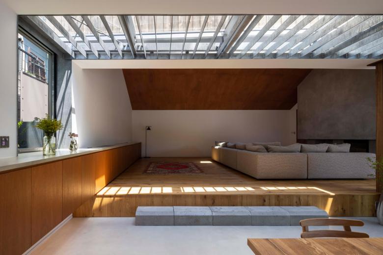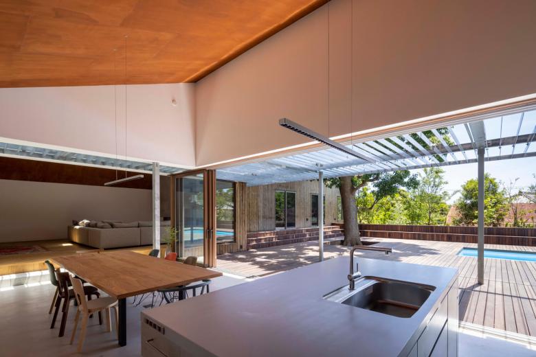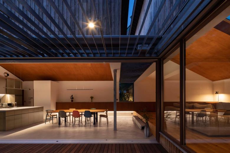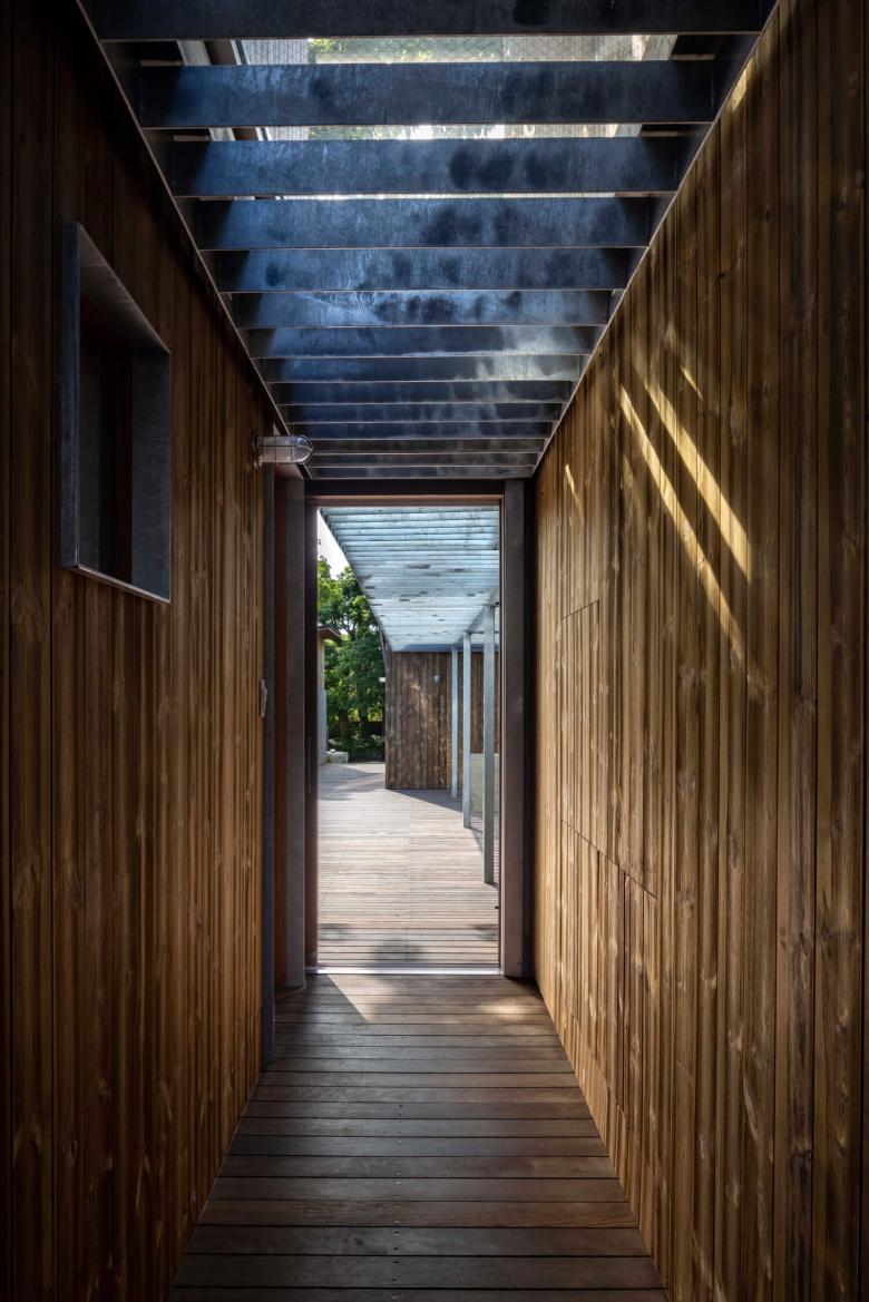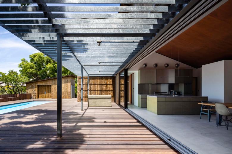 それぞれの棟の隙間は、プールサイドの中庭から周縁部に抜ける動線で、海陸風と光の通り道にもなっている。分散した建物を緩やかに繋ぐ役目を果たしているのは、溶融亜鉛メッキで仕上げたルーバーのパーゴラで、ダイニング棟の南側のデッキを覆って環境調整するだけでなく、トップライトの日除けとして各建物の隙間に入り込んでいる。