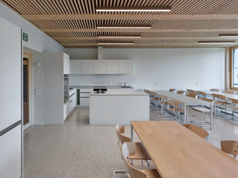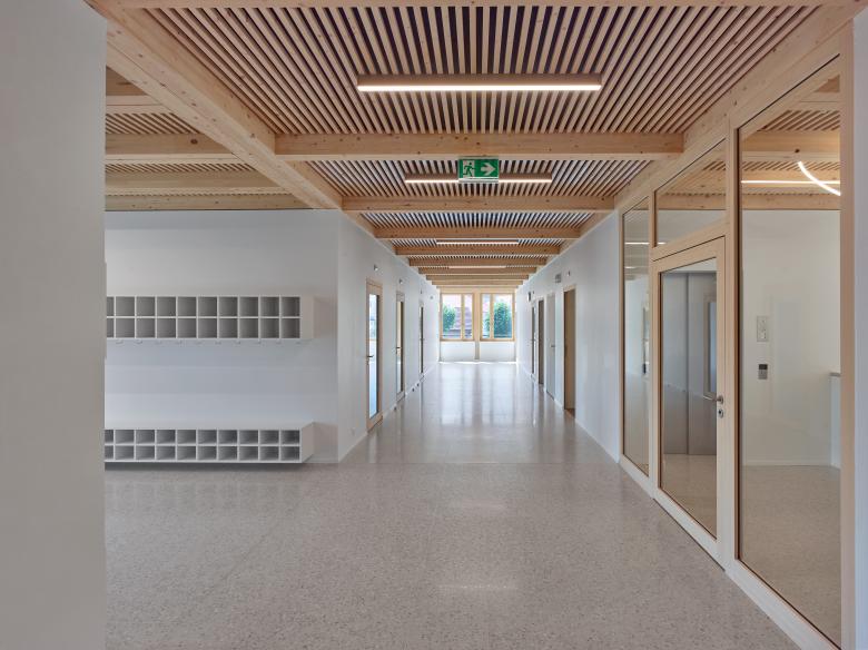 La première étape de réalisation du concours se concentre sur la partie d’accueil de l’enfance. La structure d’accueil préscolaire se place sur un niveau à l’extrémité Sud-Est, éloignée du trafic. La structure d’accueil parascolaire est, elle, prévue comme étage supplémentaire sur le même volume. Cette extension bénéficie d’une placette arborisée dans la continuité de la place de Longereuse, ainsi qu’un espace extérieur plus paisible pour la structure préscolaire à l’Est, au fil de l’Areuse.