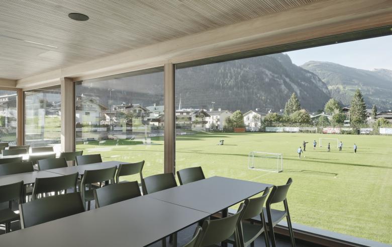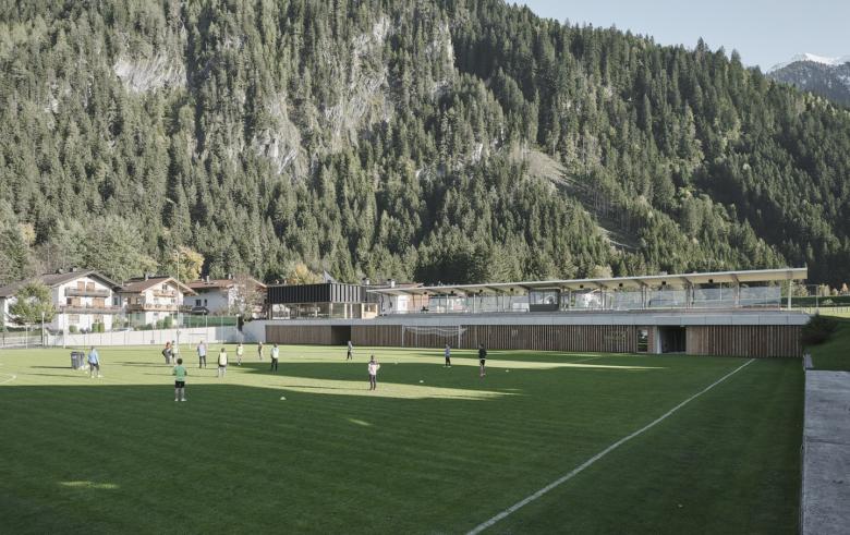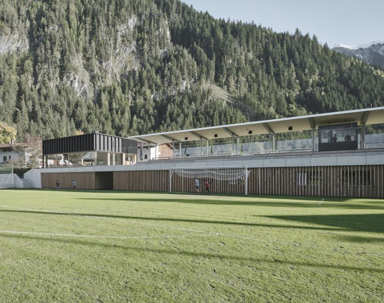 Es handelt sich um einen Trakt mit Sportgarderoben und darauf befindlicher Zuschauertribüne mit Flugdach sowie einem Hochbau mit Vereinsraum und Kantine. Während der Flachbau des Garderobentrakts durch Ausnützung der Topografie nur vom Fussballplatz aus in Erscheinung tritt ist der Hochbau an der Straßenseite bewusst sichtbar und adressbildend situiert. Unterstützt wird dieser Gedanke durch das Flugdach, das leicht und schwebend die Zuseher auf der Tribüne schützt.