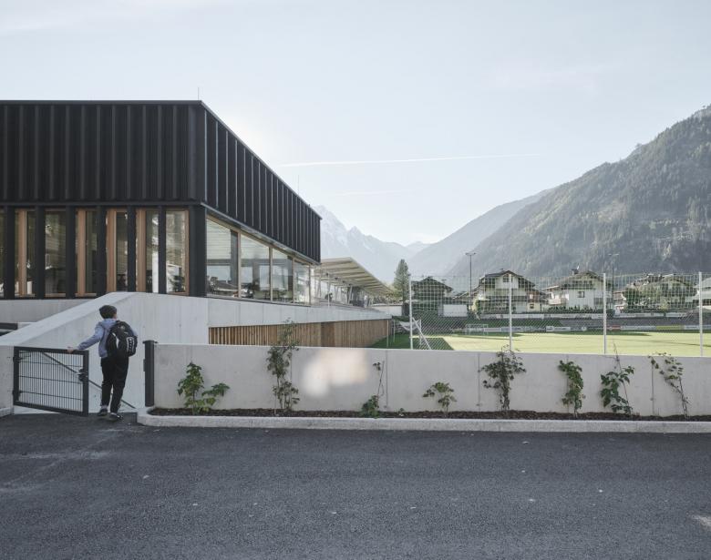 Der Bauplatz befindet sich in einem Umfeld, das geprägt ist von einer kleinteiligen Bebauung mit Einfamilienhäusern sowie kleinen bis mittleren Wohnanlagen mit unterschiedlichsten Ausrichtungen, Höhenentwicklungen und Architektursprachen. Auffallend ist eine starke Durchgrünung mit landwirtschaftlich genutzten Flächen, was dem Umfeld insgesamt einen eher dörflichen Charakter verleiht. Geplant wurde ein Neubau, welcher oberirdisch primär als Solitär in Erscheinung tritt, der einerseits selbstbewusst die Bedeutung der öffentlichen Nutzung herausstreicht, andererseits wegen der relativ geringen Kubatur der Maßstäblichkeit der umgebenden Bauten entspricht und so nicht als Fremdkörper empfunden wird.