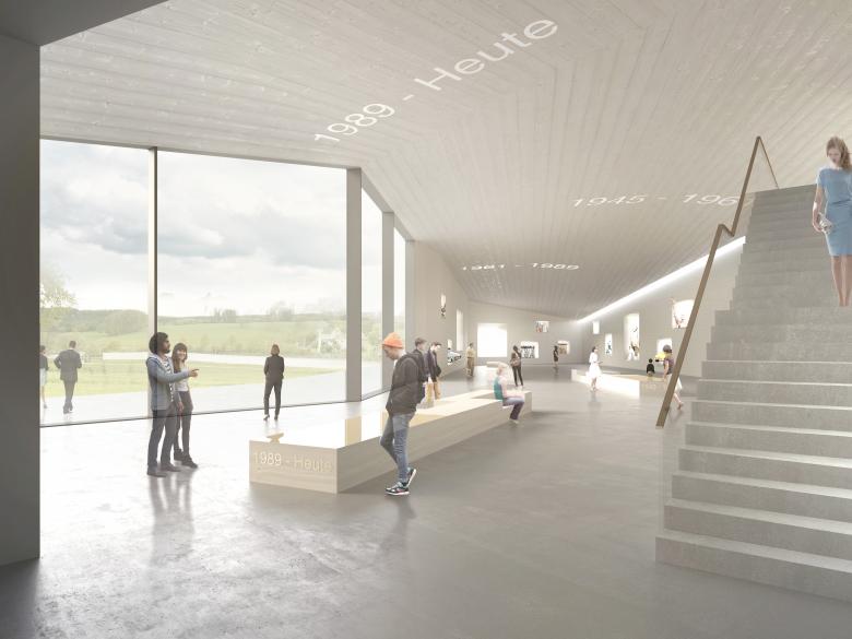 Das Dorf Mödlareuth, genannt „little Berlin“ ist ein Protagonist der Teilung Deutschlands und dokumentiert einen harten politischen und unmenschlichen Bruch durch die Fragmente der Grenzanlage. Der Entwurf für das Deutsch-Deutsche Museum bezieht gegenüber der ehemaligen Grenze eine konträre Haltung. Er schmiegt sich in die Landschaft und die Topografie ein und verwächst zu einer versöhnlichen Einheit mit dem Ort. Dennoch richtet das Museum durch seine Hauptausrichtung mit dem großen Panoramafenster, mit Blick auf die Mauer, einen klaren Blick auf die Vergangenheit.