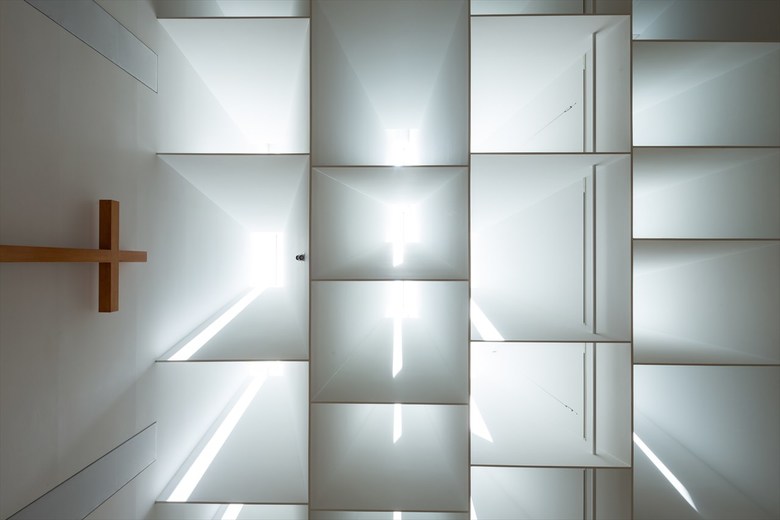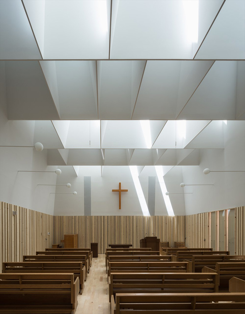 礼拝堂を中心に教会活動を支える諸室で囲み、人々を迎える大きな軒下とともに、外部とのつながりを意識した開かれた教会を目指した。中心に据えられた礼拝堂には東西両面に面するトップライトを複数設け、その下には様々な角度を持った深さ4mの光井戸と称する天井を持ち、反射光と直射光の違いや一年一日の光の変化を増幅して礼拝堂に届ける。光井戸の深さと様々な角度は、音響、熱環境にも良い効果をもたらし、教会の存在を印象付ける三角形の連続屋根を形作っている。