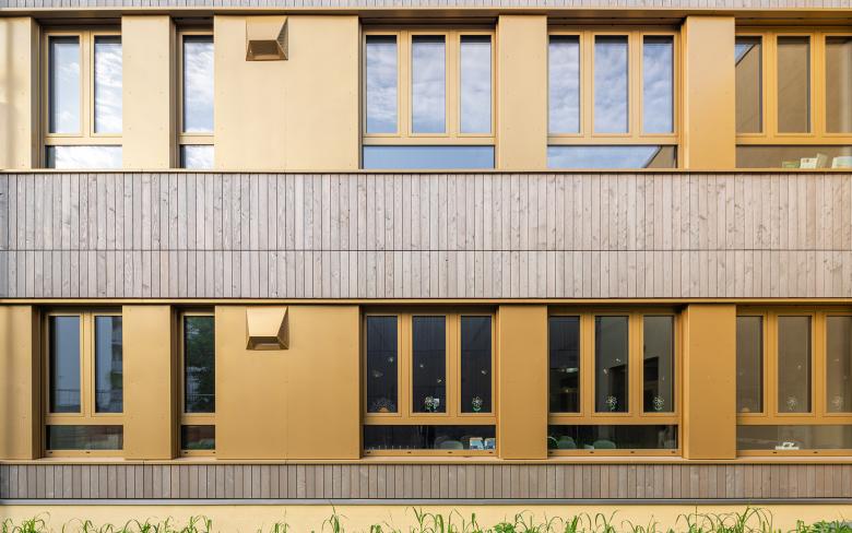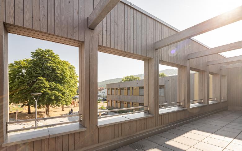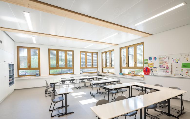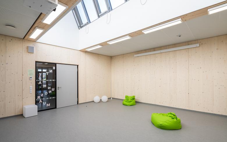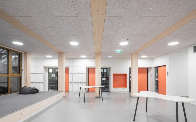 Ein zentraler Bereich in Stahlbetonbauweise verbindet die Gebäude. Die Unterrichtsbereiche wurden aus vorgefertigten Holzelementen errichtet. Die Clusterstruktur ermöglicht eine klare funktionale Gliederung, die auch brandschutztechnisch separat organisiert ist.