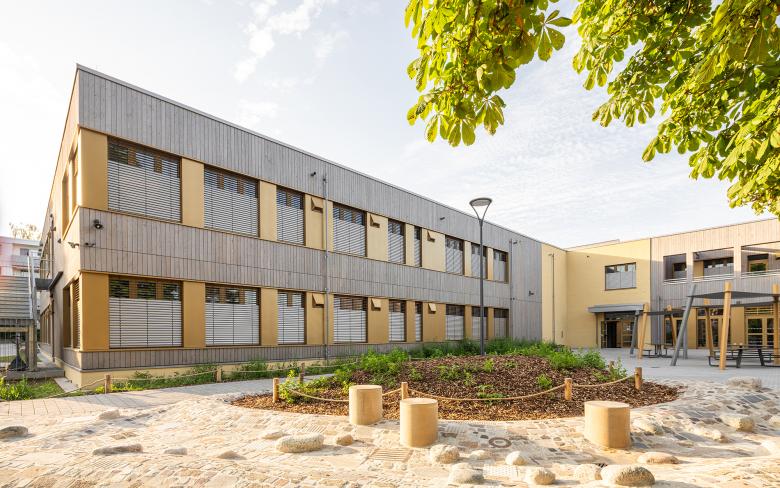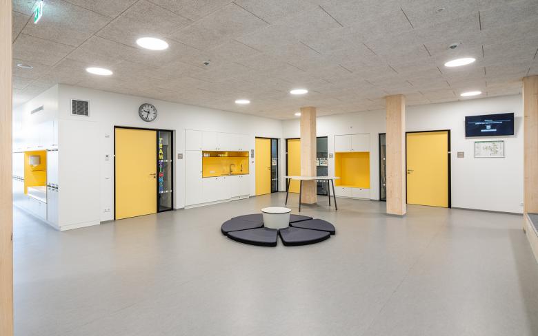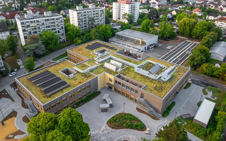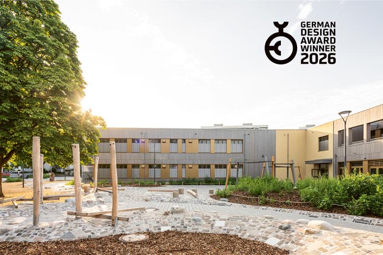 Die städtebauliche Einbindung berücksichtigt das bestehende Wohnumfeld. Alte Baumbestände, darunter drei große Eichen, wurden erhalten und in den Pausenhof integriert. Farblich differenzierte Lerncluster schaffen Orientierung im Gebäude.